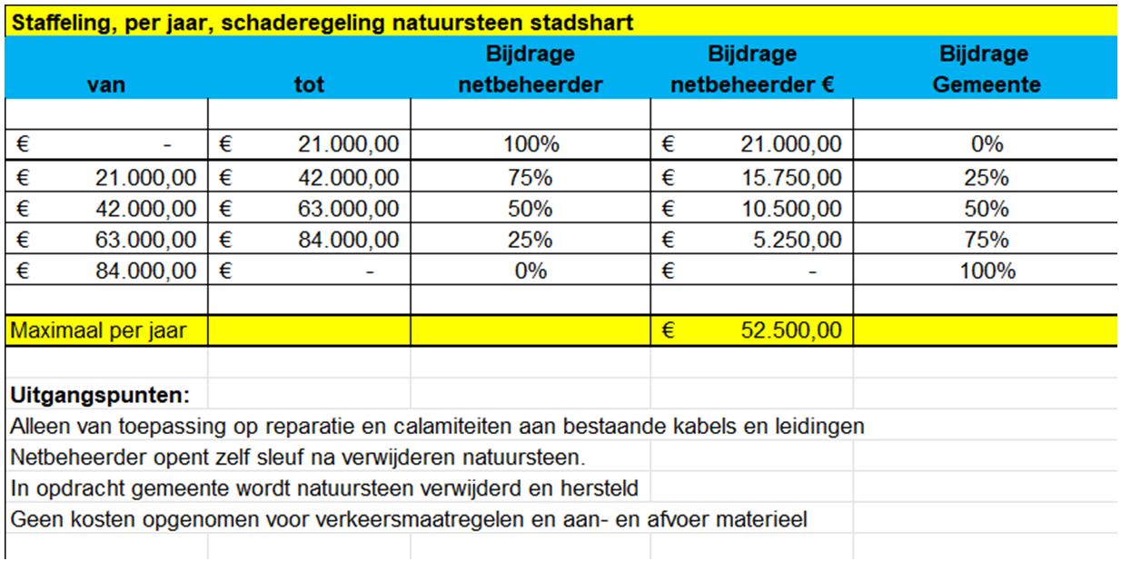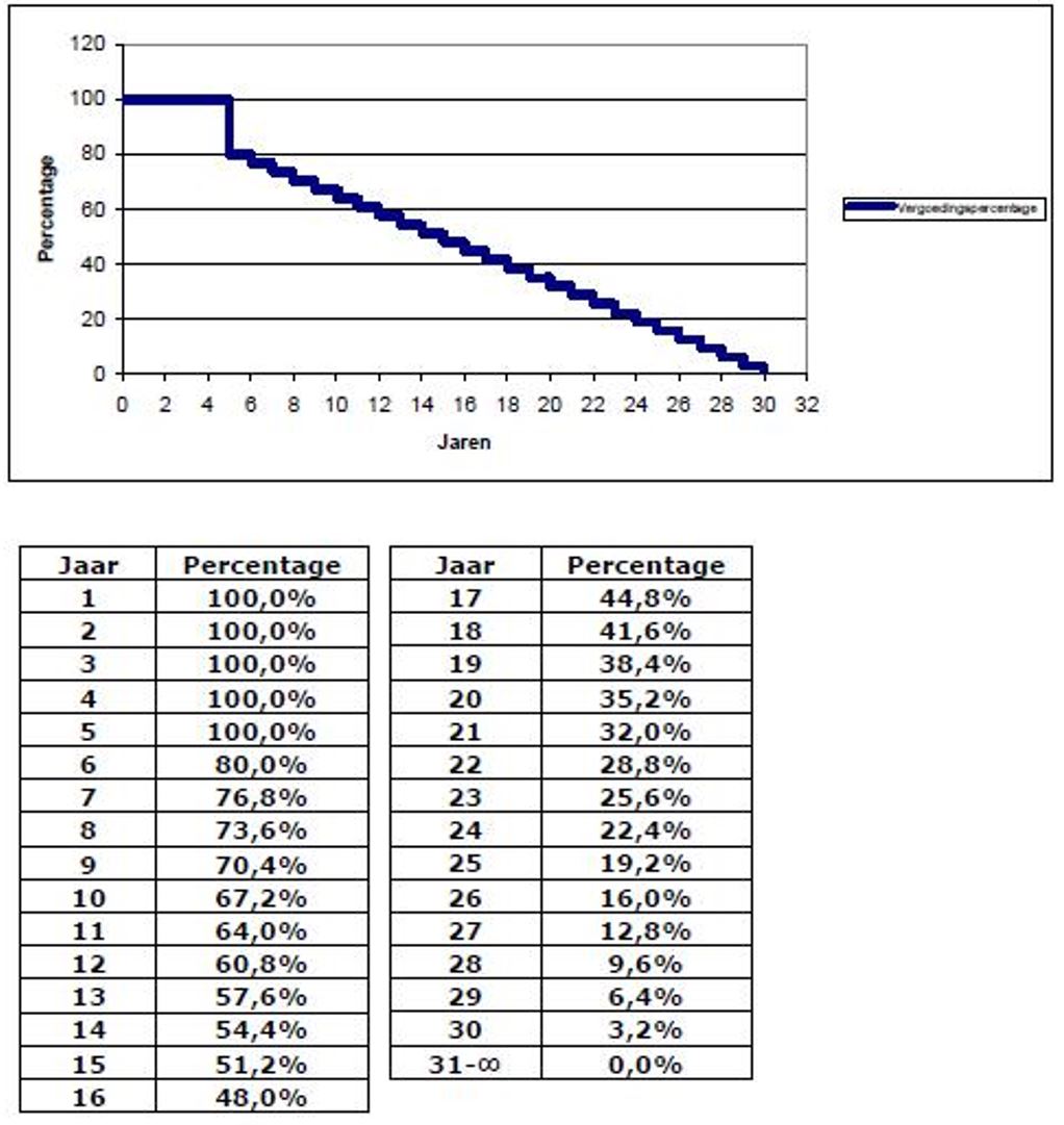 Voor natte infrastructuur geldt dat indien de netbeheerder maatregelen moet nemen ten aanzien van kabels en/of leidingen op grond van een aanwijzing in de periode gelegen vanaf vijf tot en met dertig jaren, gerekend vanaf de datum van de inwerkingtreding van de betrokken vergunning, zal de gemeente 80% van het schadebedrag vanaf het zesde jaar tot 0% vanaf het eenendertigste jaar (trapsgewijs) als nadeelcompensatie uitkeren volgens het schema weergegeven in bijlage 3.
