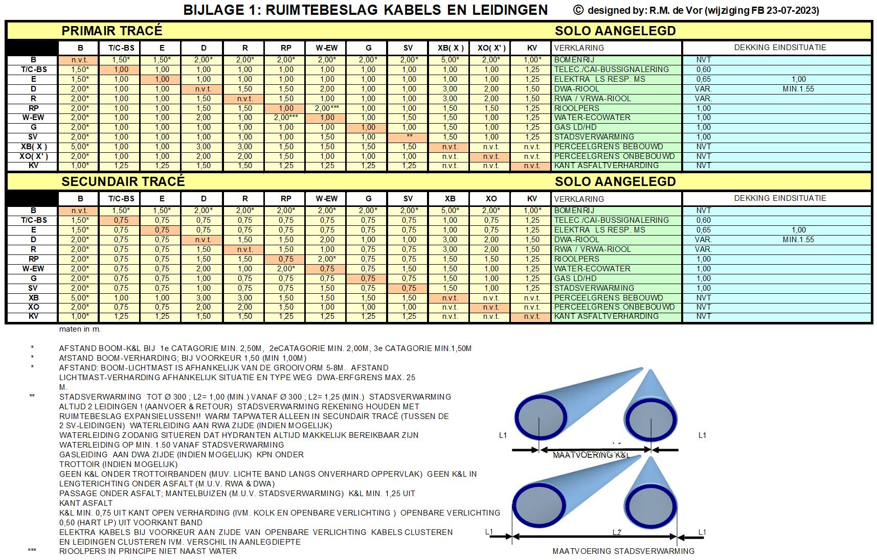 Indien bij een wegkruising de aanleg van kabels en/of leidingen door middel van een persing of (gestuurde) boring onder het wegdek wordt gerealiseerd, moet dit haaks op de wegas minimaal 1,00 m uit de tangentpunten en zodanig uitgevoerd worden zodat er geen verzakking of bolling in de verharding kan optreden. Ook moet deze op minimaal 3,00 m vanaf het zichtbare deel van de stamvoet van een boom gesitueerd worden. De persing of (gestuurde) boring moet bij voorkeur voorafgaand aan het graven van de sleuf voor het hoofdtracé gerealiseerd worden. Het aanbrengen van een (stalen) mantelbuis is daarbij verplicht, tenzij met de technicus k&l anders wordt overeengekomen.
