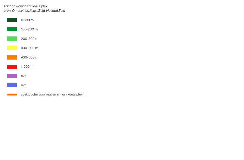 Onlangs is een ‘koele plekkenkaart’ opgesteld (zie bijlage 4). Deze kaart laat zien wat de afstand van een woning tot een koele plek is. Hieruit blijkt dat er behoefte is aan het realiseren van 7 koele plekken. Een koele plek is een plek waar het op warme dagen aantrekkelijk is om te verblijven. Kenmerken koele plek: op 300m van de woning, minimaal 200m² groot, groen, 50% beschaduwd met zit- en/of speelgelegenheid. Op sommige plekken is een kleine inspanning nodig om het gewenste resultaat te bereiken, door bijvoorbeeld een aantal bomen te planten, zitgelegenheden of beplantingen te realiseren. Op andere plekken zal meer inzet nodig zijn.