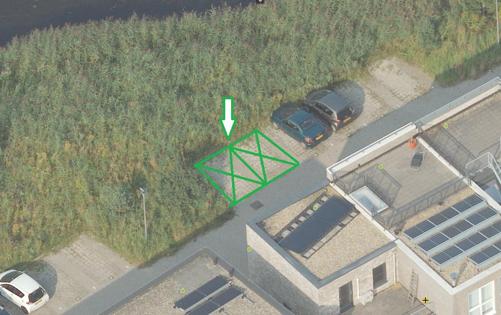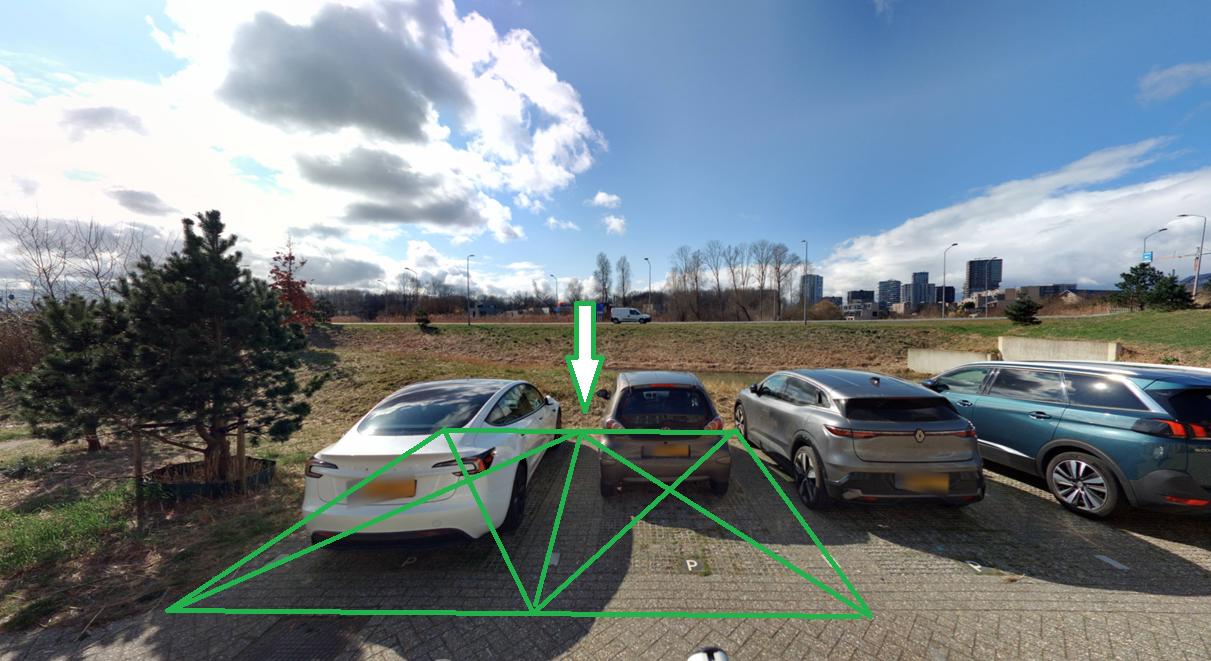 De parkeerplaatsen zijn alleen bedoeld voor het opladen van elektrische auto’s. Daarom plaatsen we het verkeersbord E08c (dit staat in bijlage I van het RVV 1990). We plaatsen ook het verkeersbord OB504 daaronder. Dit is een bord met twee pijlen die wijzen naar de parkeerplaatsen.