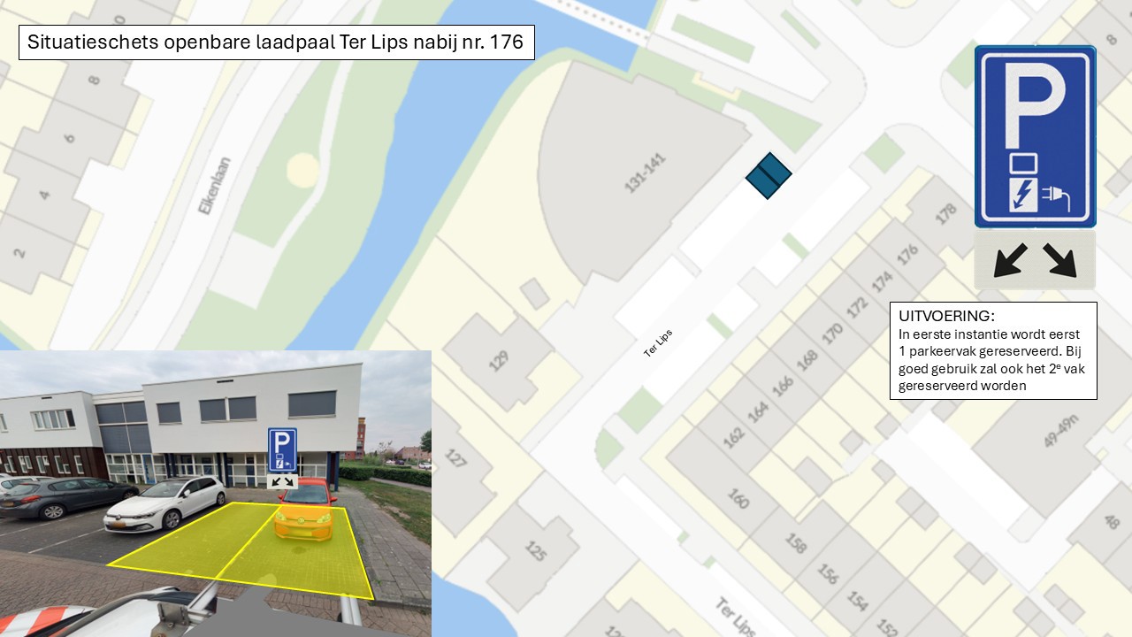 door het plaatsen van bord E8c van Bijlage 1 van het Reglement verkeersregels en verkeerstekens 1990 met het onderbord (OB504) dat met twee pijlen aangeeft op welke vakken het betrekking heeft, waarbij in eerste instantie maar een pijl wordt geplaatst en daarmee op de volgende twee locaties parkeerplaatsen aan te wijzen die het opladen van elektrische voertuigen als specifiek doel hebben: