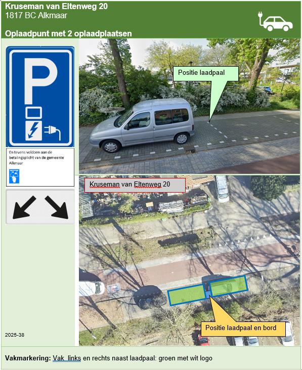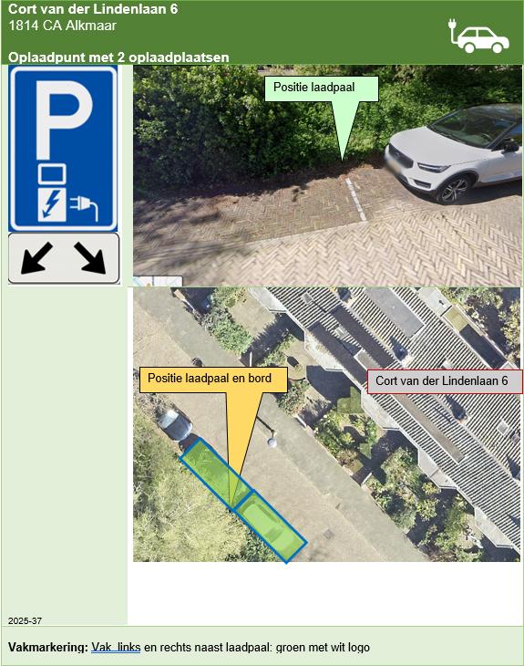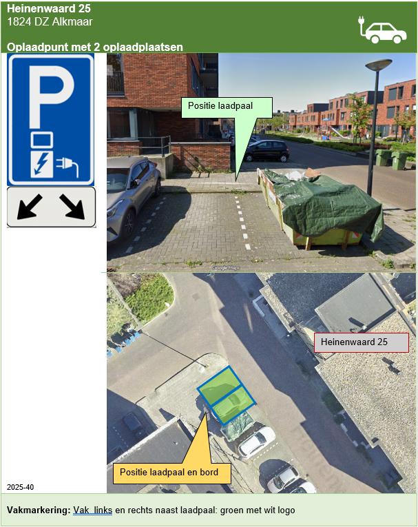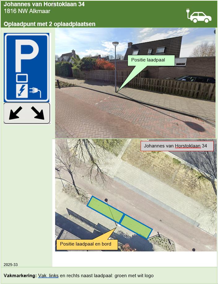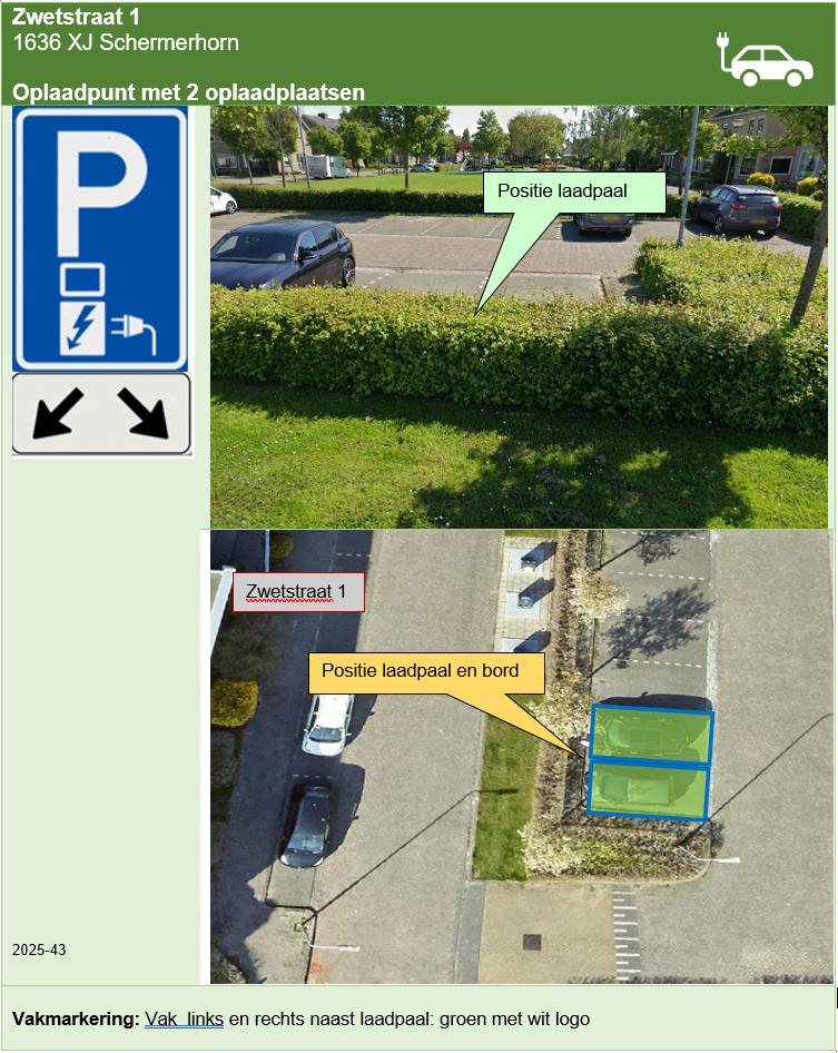 Op de volgende locaties twee parkeerplaatsen aan te wijzen als oplaadpunt voor een elektrisch voertuig. De maatregel zal ter plaatse worden aangeduid door het bord conform model E8c van bijlage 1 van het Reglement Verkeersregels en Verkeerstekens (RVV 1990), parkeergelegenheid alleen bestemd voor het opladen van elektrische voertuigen, en het onderbord OB504.De borden worden geplaatst zoals aangegeven op de bij dit besluit behorende tekeningen.