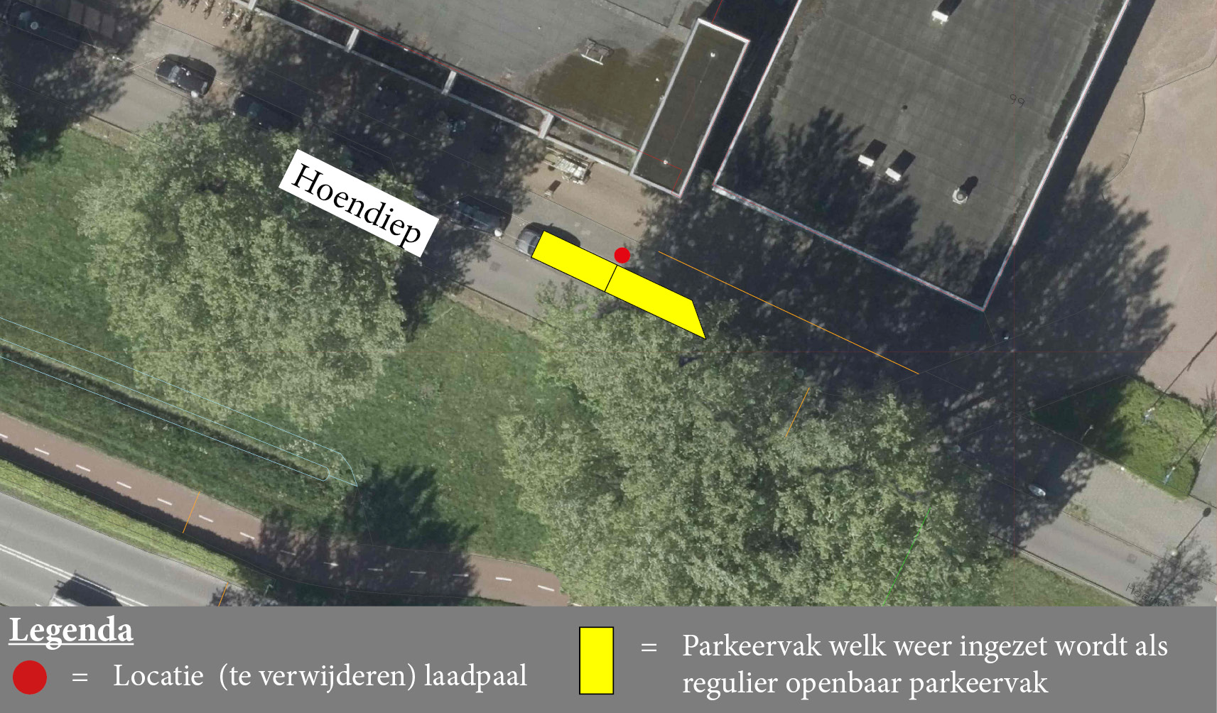 Wij besluiten op grond van bovenvermelde overwegingen de aanwijzing ‘parkeervakken alleen bestemd voor het opladen van elektrische voertuigen’ op de twee eerder aangewezen parkeervakken, bij de (te verwijderen) laadpaal aan het Hoendiep ten zuiden van nummer 99, op te heffen. De twee parkeervakken worden weer ingezet als reguliere openbare parkeervakken.
