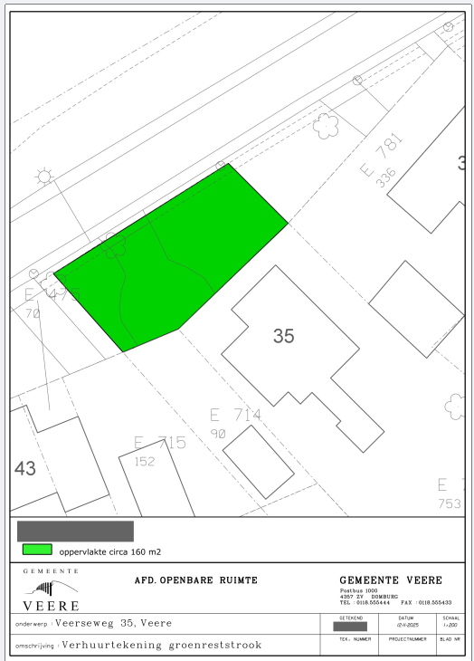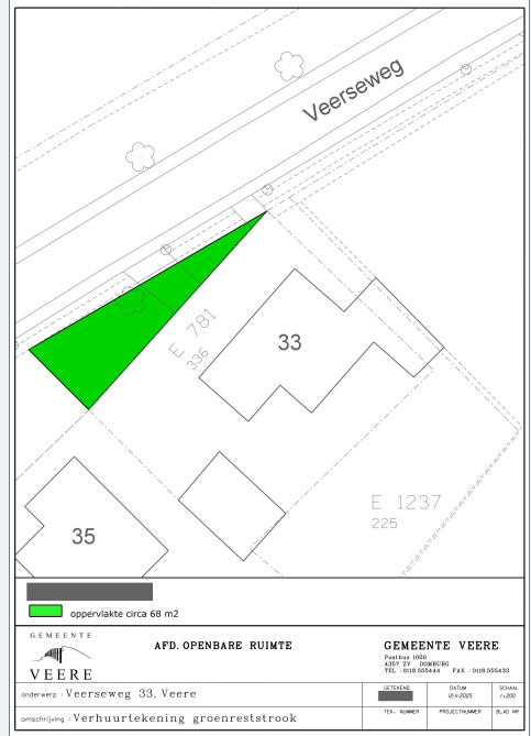 De gemeente Veere heeft het voornemen om twee stroken grond van het perceel, gelegen bij en grenzend aan Veerseweg 33 en Veerseweg 35 te Veere, deel uitmakende van het perceel kadastraal bekend gemeente Veere, sectie E nummer 1311 te verhuren aan de aangrenzende perceelseigenaren. De te verhuren groenstroken zijn in het groen weergegeven op bijgaande verhuurtekeningen.