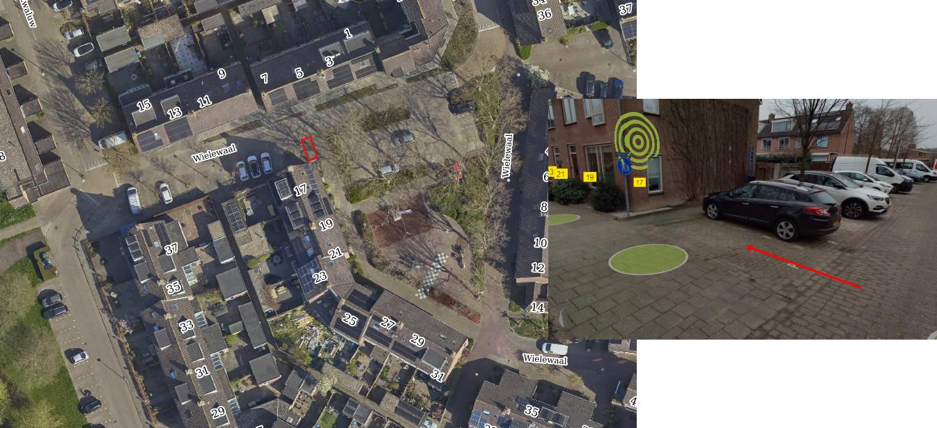 - Hiertoe een aangewezen parkeervak, gelegen aan de Wielewaal, te voorzien van het verkeerbord E6 van bijlage I van het Regelement Verkeersregels en Verkeerstekens 1990, met onderbord met het bijbehorende kenteken en in overleg met aanvrager wordt aangepast naar de bijbehorende maatvoering;