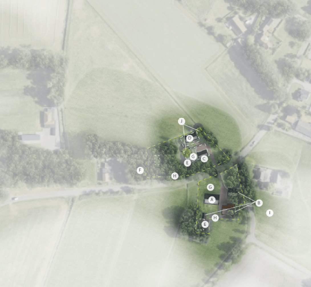 De woonboerderij (A) wordt behouden. Ook de twee karakteristieke bijgebouwen zullen behouden worden (B). Twee gebouwen achter de woning worden gesaneerd. Aan de noordzijde van de straat worden ook de voormalige agrarische gebouwen gesloopt (alle bebouwing aangegeven met E) en ook de kuilplaten zullen worden verwijderd. Op het noordelijk deel van het erf wordt een nieuwe compensatiewoning gerealiseerd (D) met bijgebouwen (C). Het erf zal worden ingepast in het bestaande essenlandschap waarbij gebruik gemaakt wordt van bestaande (te behouden) houtopstanden (F). Dat betekent dat robuuste elementen uit het essenlandschap worden benut. Er worden nieuwe erfbomen aangeplant (J) met de soorten: Linde en/ of Walnoot.