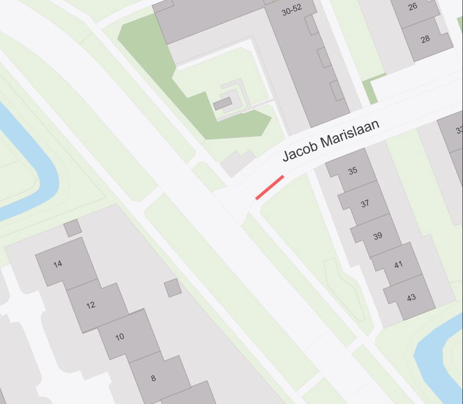Het aanbrengen gele onderbroken 1-1 streep op de trottoirband op de Jacob Marislaan ter hoogte van de ondergrondse containers;
