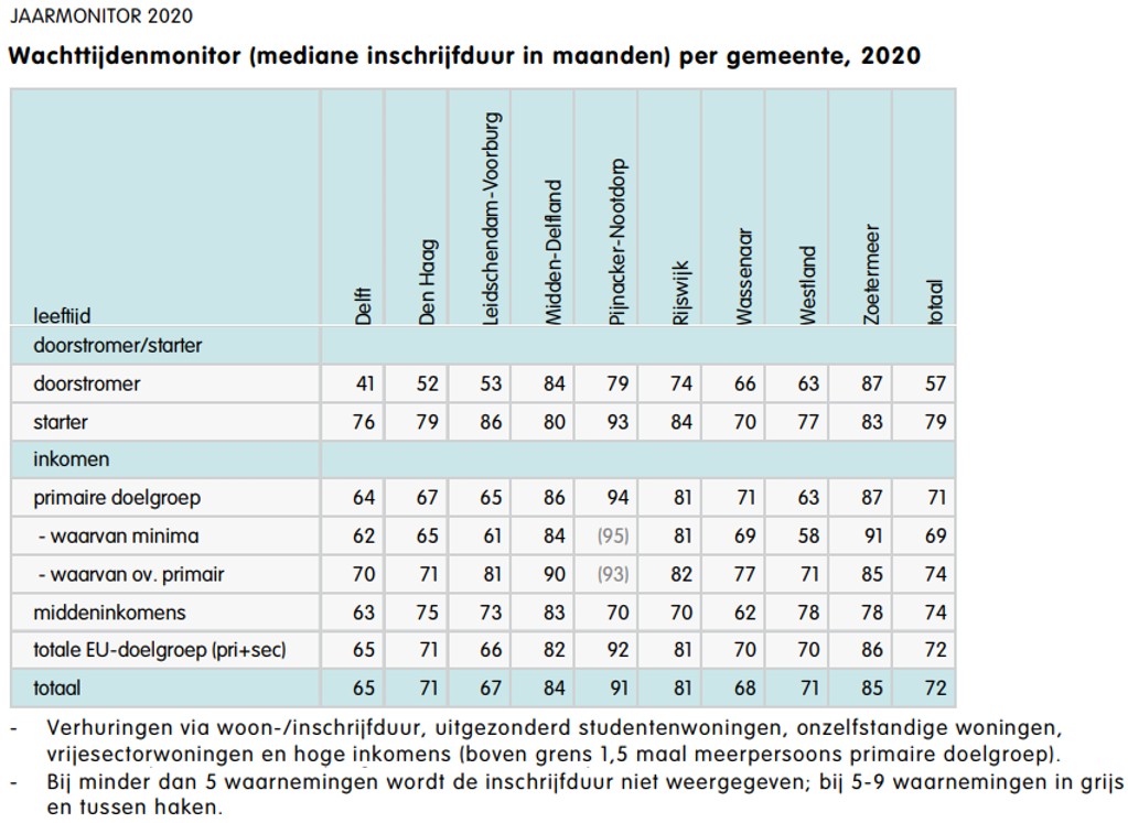 In Pijnacker-Nootdorp is de mediane inschrijfduur (exclusief lokaal maatwerk) het hoogste met 91 maanden. Daar waar een doorstromer in de regio in 2020 een mediane inschrijfduur heeft van 57 maanden, is dit in Pijnacker-Nootdorp 79 maanden. Voor een starter is dit 79 maanden in de regio en 93 maanden in Pijnacker-Nootdorp.