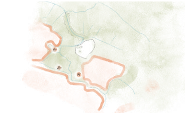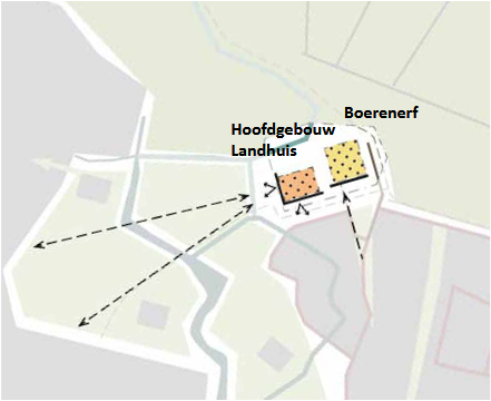 De vermoedelijke erfstructuur wordt deels hersteld door het hoofdgebouw richting het westen te oriënteren en de bijgebouwen orthogonaal te positioneren ten opzichte van dit hoofdgebouw. Om de verbinding met de woonwijk te creëren krijgt het landhuis ook een zichtzijde richting het zuiden. Hiermee ontstaat een harmonieuze en overzichtelijke erfstructuur, geïnspireerd op de oude havezate.