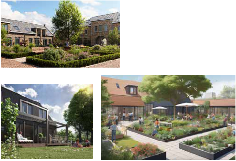 Een sociale functie, zoals een moestuin of boomgaard, wordt geïntegreerd in het ontwerp. Ook wordt een gemeenschappelijk terras met verblijfsruimte toege- voegd om het gemeenschapsgevoel te versterken.
