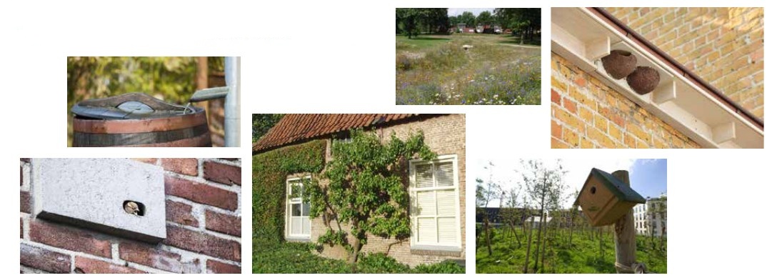 Bebouwing: Ingebouwde voorzieningen voor vleermuizen, nestkasten voor huismussen en nestkommen voor zwaluwen worden in de gevels verwerkt (in samenspraak met een ecoloog). Klimplanten zoals klimop, wilde kamperfoelie en bosrank verhogen de ecologische waarde van muren.