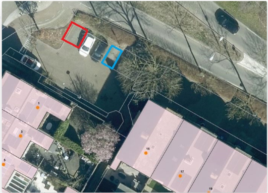 (rood = de nieuw aan te wijzen gereserveerde gehandicaptenparkeerplaats, blauw = de te vervallen gereserveerde gehandicaptenparkeerplaats)