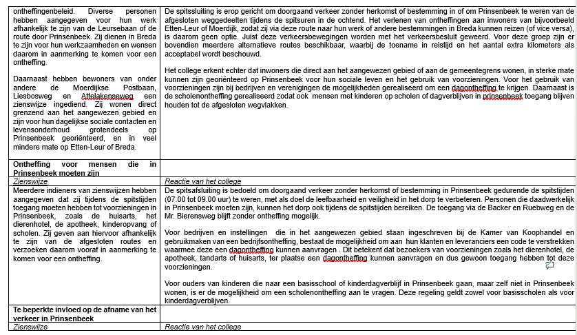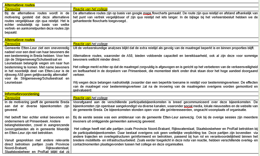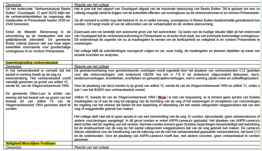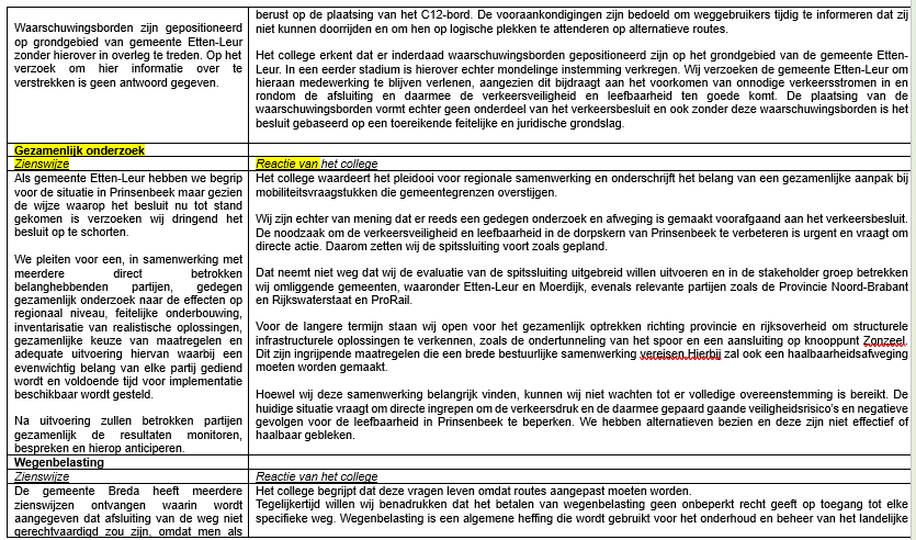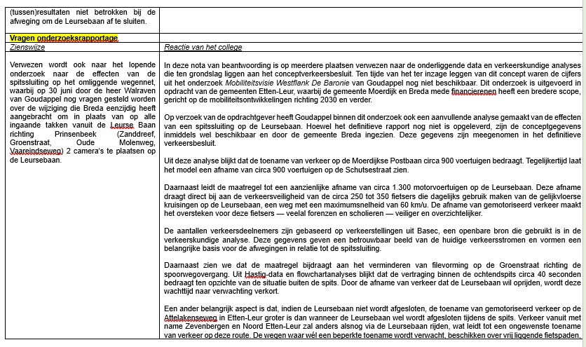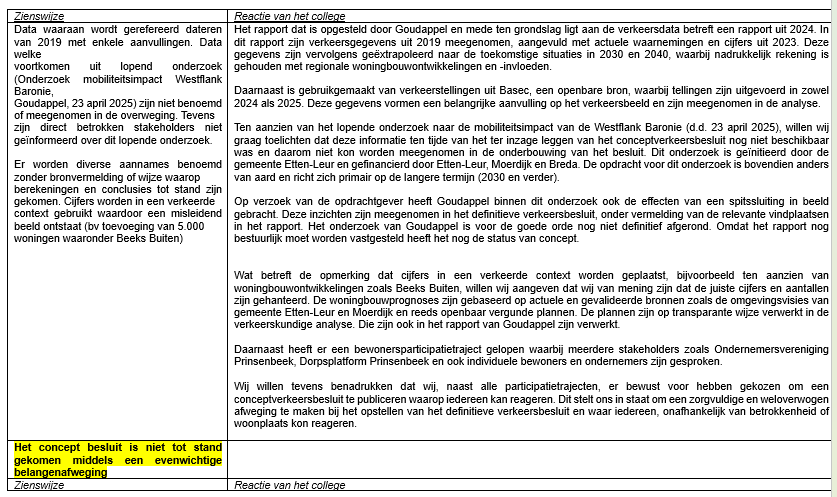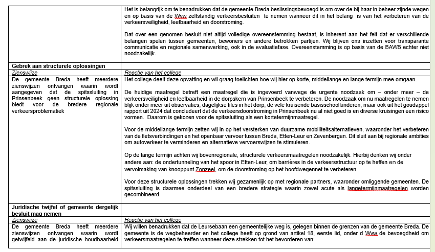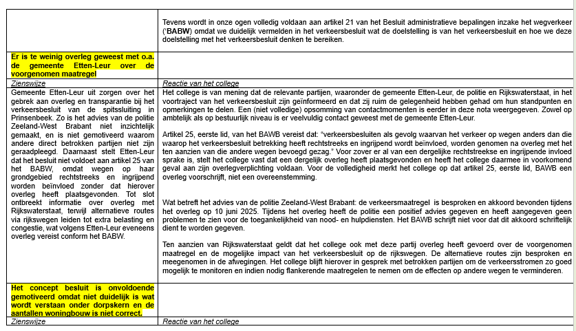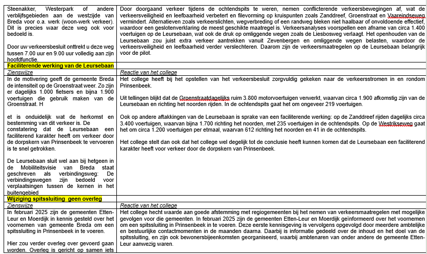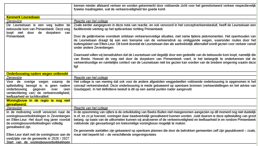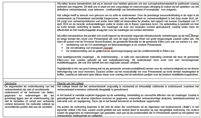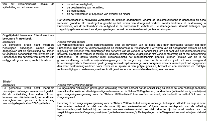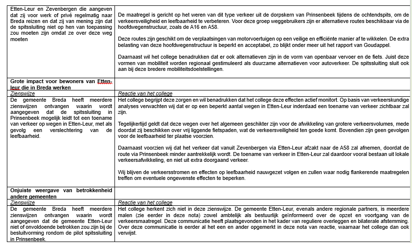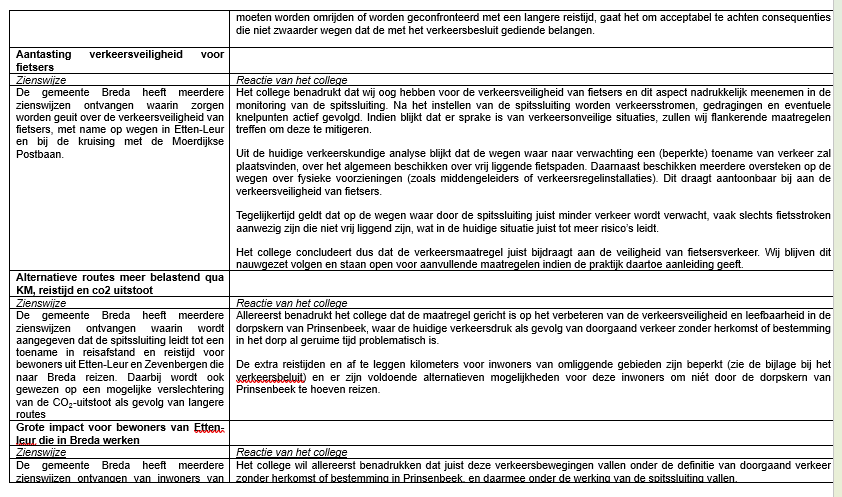 De infrastructuur in Etten-Leur is grotendeels voorzien van vrij liggende fietspaden, waardoor de risico’s voor fietsers aanzienlijk lager zijn dan op de wegen met fietsstroken in Prinsenbeek. Het absolute aantal geregistreerde ongevallen in Prinsenbeek bevestigt dat de verkeerssituatie daar risicovoller is. Het college erkent dat de spitsafsluiting leidt tot een (beperkte) toename van de verkeersdruk op een aantal wegen in Etten-Leur. Gezien de robuuste infrastructuur in Etten-Leur en het beperkte aantal ongevallen, wordt het belang van de afname van verkeersdruk in Prinsenbeek als zwaarder wegend beschouwd dan de toename in Etten-Leur en Zevenbergen. Bedacht moet daarbij worden dat de grote druk op de wijkontsluitingswegen in Prinsenbeek in belangrijke mate wordt veroorzaakt door verkeer afkomstig uit onder meer Etten-Leur dat een route door Prinsenbeek verkiest boven de beschikbare regionale infrastructuur uitsluitend om een relatief beperkte verkorting van de reisduur te realiseren. Dat het tegengaan van de aanzienlijke negatieve gevolgen leidt tot een relatief beperkte toename van verkeer op bepaalde wegen in Etten-Leur, weegt in de gegeven omstandigheden echter minder zwaar dan de aanzienlijke positieve effecten die de verkeersmaatregel heeft voor Prinsenbeek.