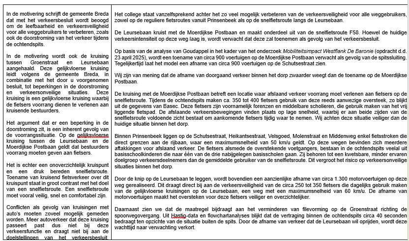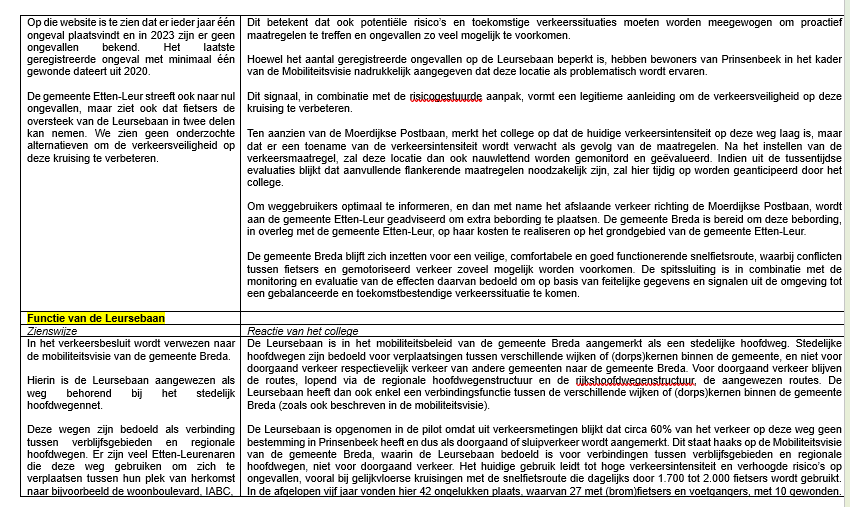 Daarentegen draagt de spitsafsluiting aantoonbaar bij aan een verbetering van de verkeersveiligheid op wegen zoals de Leursebaan, waar sprake is van een maximumsnelheid van 60 km/u en meerdere gelijkvloerse kruisingen met intensief fietsverkeer. In dat licht wordt de lokale toename op de Moerdijkse Postbaan als acceptabel beschouwd en weegt de positieve impact op de verkeersveiligheid, leefbaarheid en de bescherming van het milieu in Prinsenbeek zwaarder.