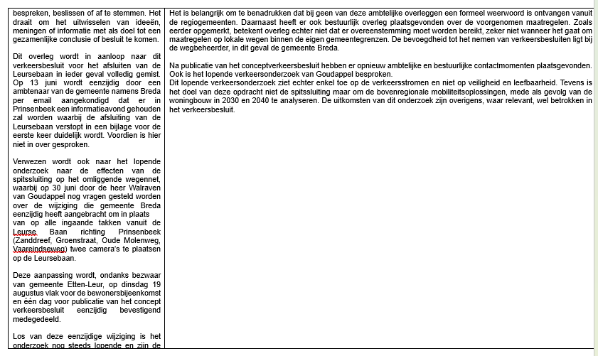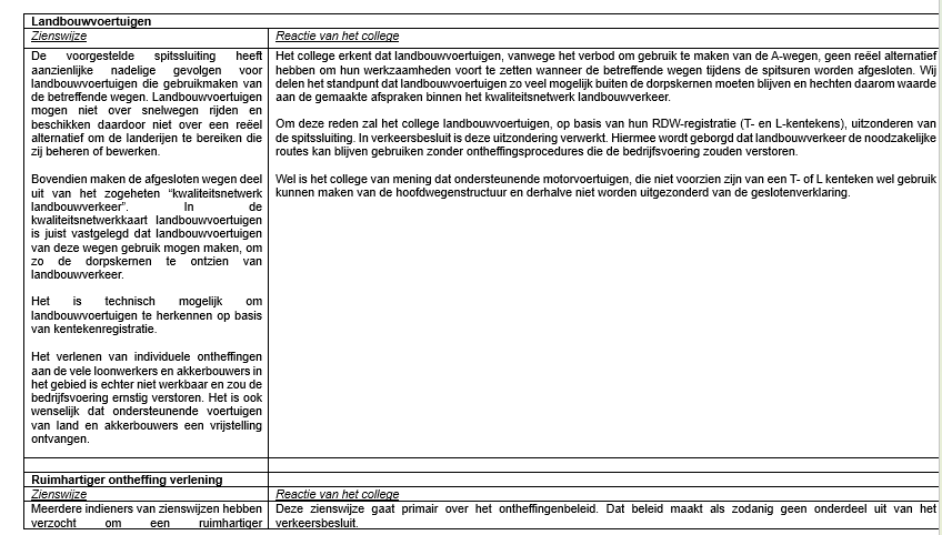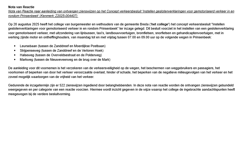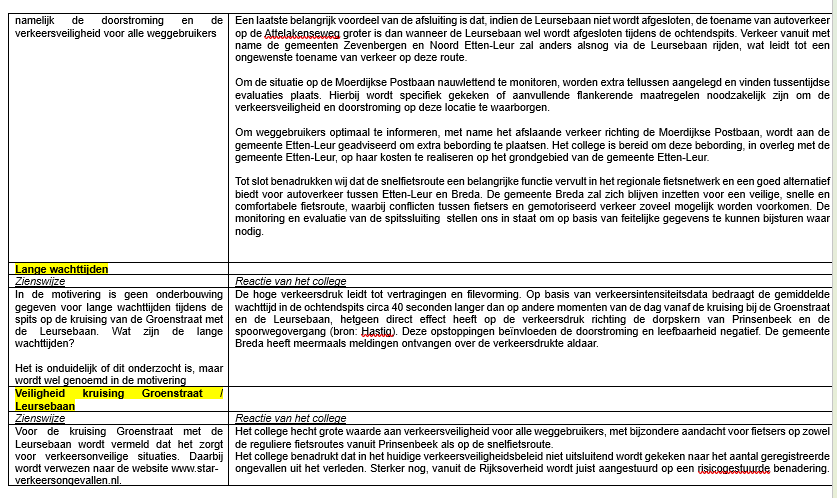 Om belanghebbenden de gelegenheid te geven hun mening te geven, heeft de gemeente Breda op 19 augustus 2025 een conceptverkeersbesluit gepubliceerd. Gedurende een periode van vier weken kon hierop worden gereageerd. Het doel van deze procedure was om inspraak te bieden op het conceptverkeersbesluit. Voor de volledigheid merkt het college op dat afdeling 3.4 van de Algemene wet bestuursrecht niet van toepassing is op dit verkeersbesluit. In totaal zijn 522 reacties ontvangen. Deze reacties zijn zorgvuldig afgewogen en hebben geleid tot enkele aanpassingen in het definitieve verkeersbesluit. In de bijbehorende nota van reactie, die als bijlage bij het verkeersbesluit is gevoegd, gaat het college inhoudelijk in op de ingediende zienswijzen.