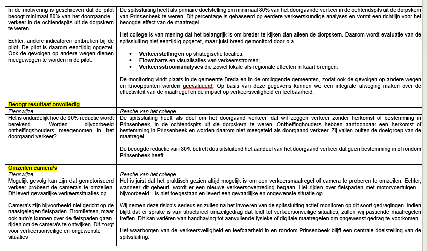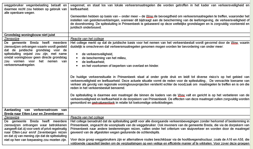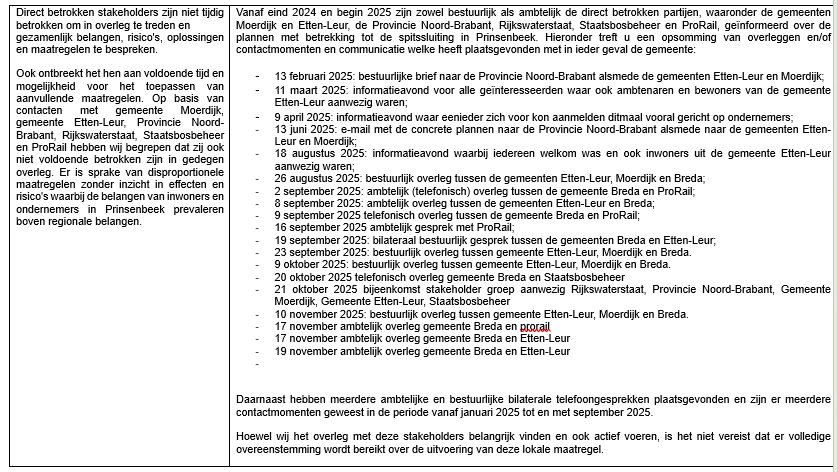 Het college hecht grote waarde aan transparante communicatie en actieve betrokkenheid van de inwoners en ondernemers uit Prinsenbeek. In dit kader zijn in de afgelopen periode diverse bijeenkomsten georganiseerd. Op 11 maart 2025 vond een brede informatiebijeenkomst plaats voor bewoners en ondernemers, gevolgd door een specifieke ondernemersavond op 9 april 2025. Daarnaast zijn tussen 11 maart en 26 juni 2025 meerdere overleggen gevoerd met het Dorpsplatform Prinsenbeek en de Ondernemersvereniging Prinsenbeek. In de periode van 3 juni tot en met 26 juni 2025 zijn bovendien meer dan 25 ondernemers en maatschappelijke instellingen in Prinsenbeek persoonlijk bezocht om met hen in gesprek te gaan over mogelijke oplossingsrichtingen voor de hiervoor beschreven structurele problemen op het gebeid van verkeersveiligheid, leefbaarheid en milieu als gevolg van het structurele gebruik van het lokale wegennet door regionale verkeersstromen.