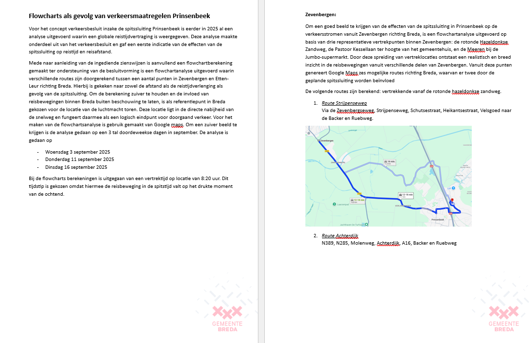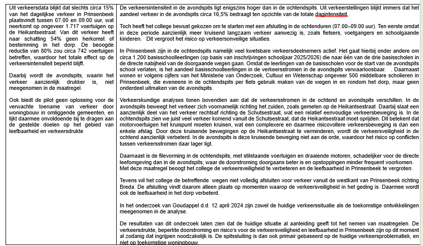 Op verzoek van de gemeenten Etten-Leur, Moerdijk en Breda heeft bureau Goudappel een aanvullend onderzoek uitgevoerd naar de effecten van de spitsafsluiting op de mobiliteitsbewegingen aan de westflank van de Baronie (Goudappel 2025). Uit deze analyse blijkt, zoals eerder in dit verkeersbesluit is vermeld, dat de verkeersdruk in en rondom Prinsenbeek aanzienlijk afneemt. Deze afname draagt aantoonbaar bij aan een verbetering van de verkeersveiligheid en een toename van de leefbaarheid in de dorpskern.
