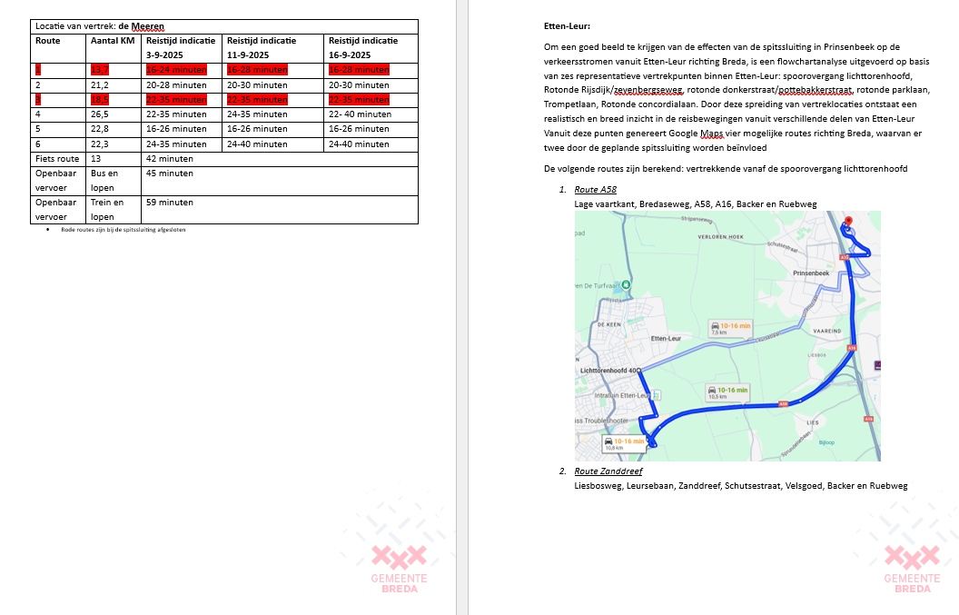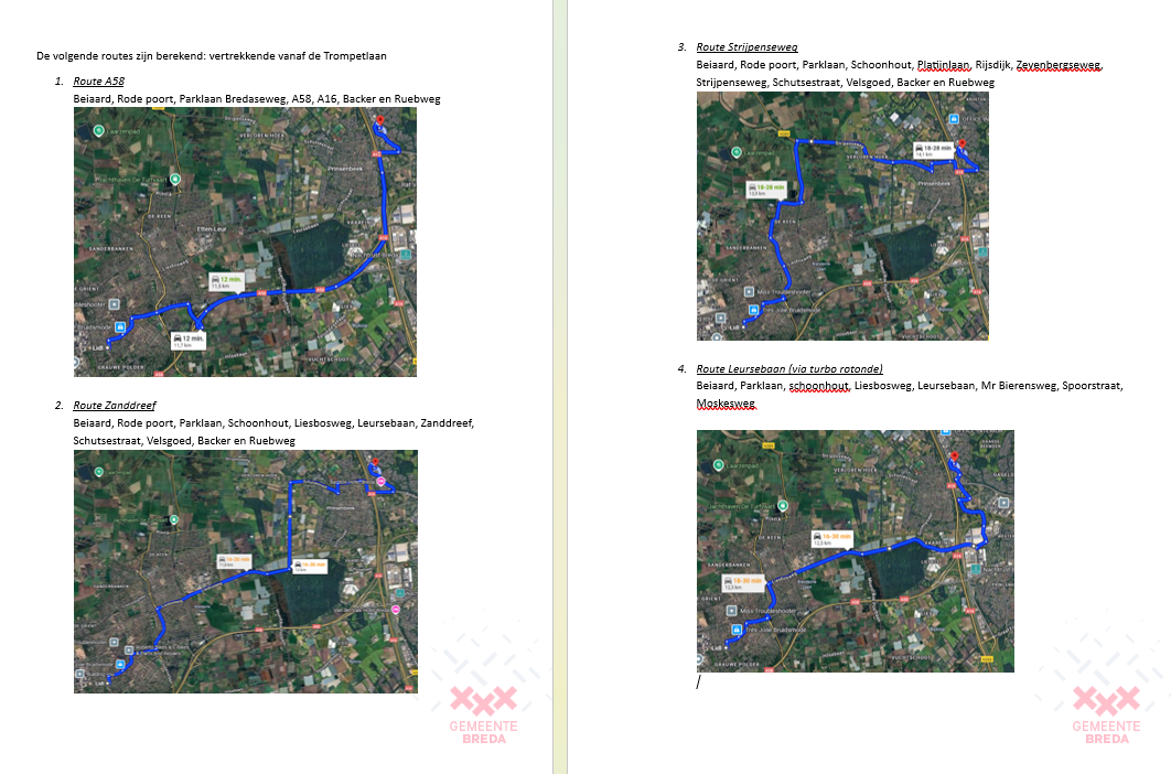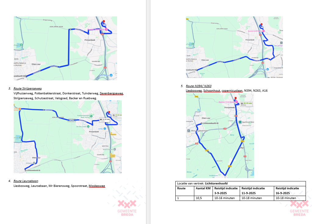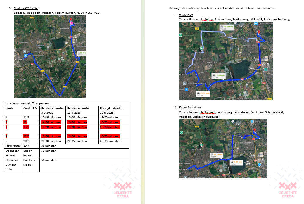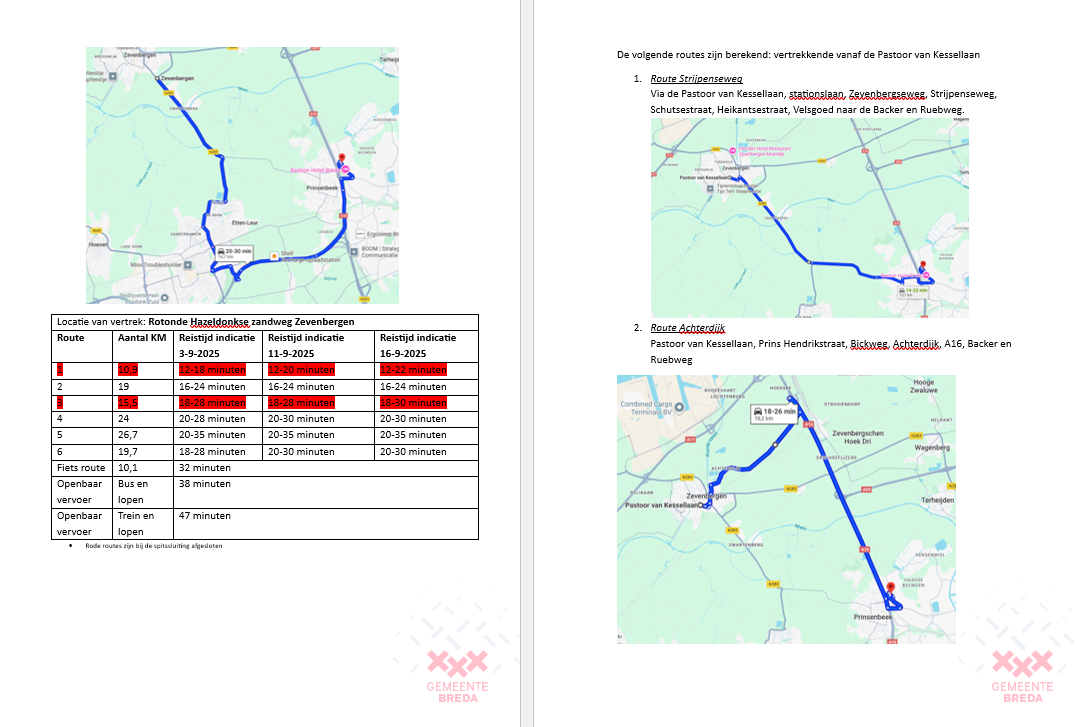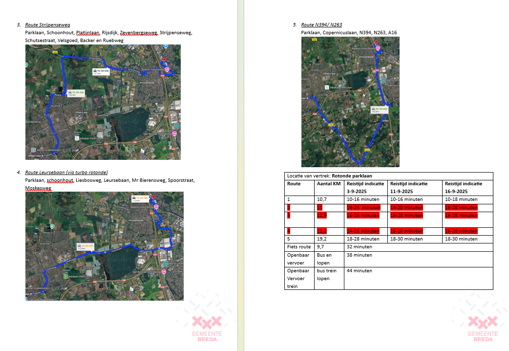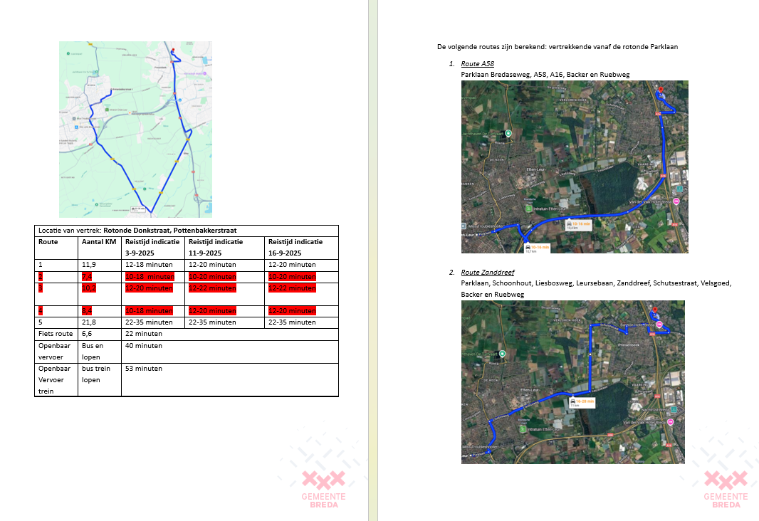 De vertrektijd voor alle berekeningen is vastgesteld op 08:20 uur, om de verkeerssituatie tijdens het drukste moment van de ochtendspits te simuleren. Als vast eindpunt is gekozen voor het Luchtmachtplein in Breda, net over de A16. In de bijlage bij het verkeersbesluit zijn per vertreklocatie flowcharts opgenomen waarin de mogelijke routes, reistijden en alternatieven zijn weergegeven. Hierbij is ook inzichtelijk gemaakt hoe de reistijd zich verhoudt tot de route die tijdens de spits niet beschikbaar is (rood gearceerde tijden). Tevens zijn alternatieve vervoerswijzen zoals openbaar vervoer (bus en trein) en de fiets meegenomen in de analyse.
