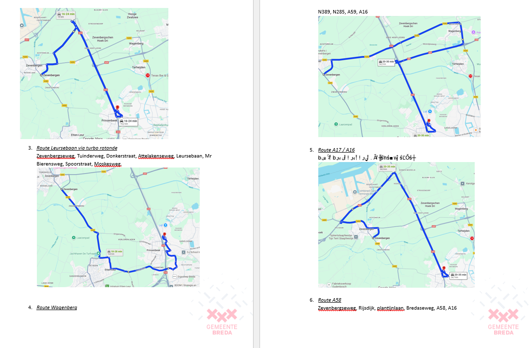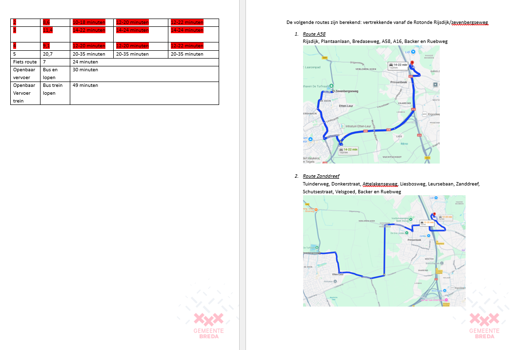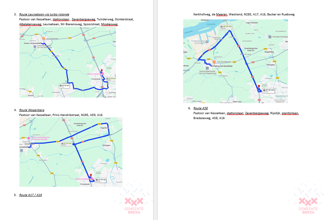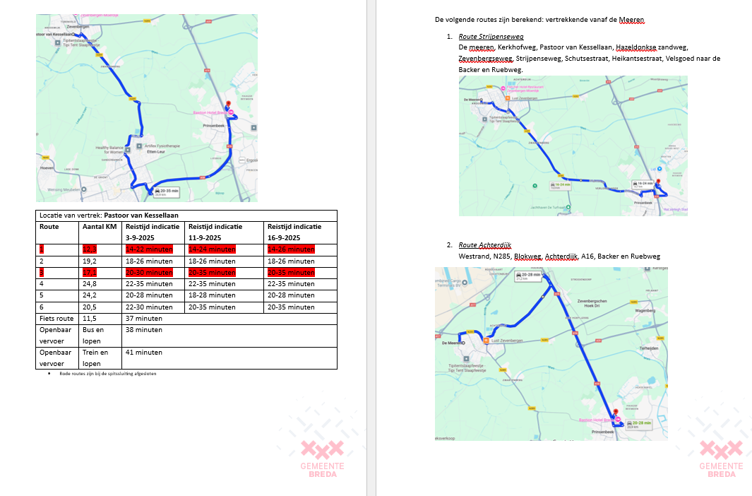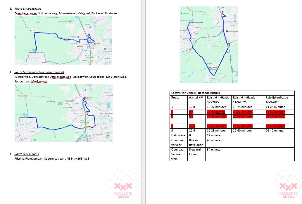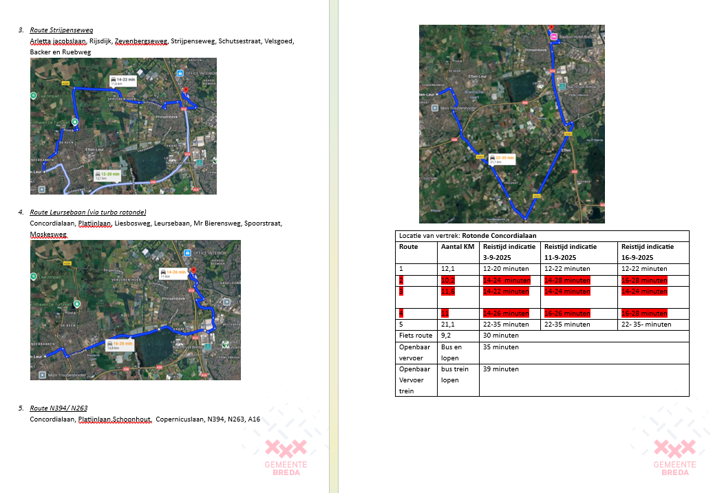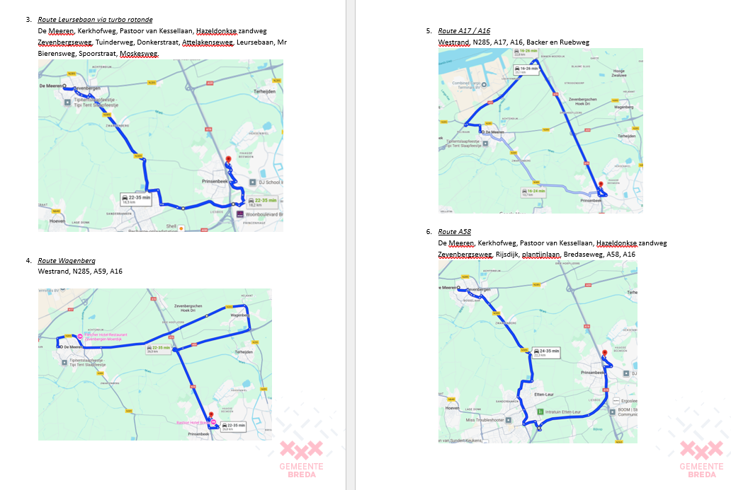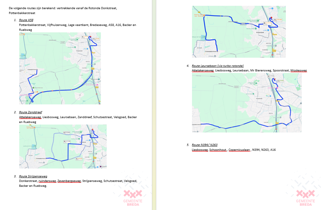 De vertrektijd voor alle berekeningen is vastgesteld op 08:20 uur, om de verkeerssituatie tijdens het drukste moment van de ochtendspits te simuleren. Als vast eindpunt is gekozen voor het Luchtmachtplein in Breda, net over de A16. In de bijlage bij het verkeersbesluit zijn per vertreklocatie flowcharts opgenomen waarin de mogelijke routes, reistijden en alternatieven zijn weergegeven. Hierbij is ook inzichtelijk gemaakt hoe de reistijd zich verhoudt tot de route die tijdens de spits niet beschikbaar is (rood gearceerde tijden). Tevens zijn alternatieve vervoerswijzen zoals openbaar vervoer (bus en trein) en de fiets meegenomen in de analyse.