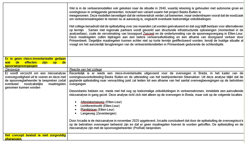 In het kader van een zorgvuldige besluitvorming en betrokkenheid zijn er meerdere informele ambtelijke (telefonische) gesprekken gevoerd met ProRail. Daarnaast heeft op 2, 9 en 19 september 2025 ambtelijk overleg plaatsgevonden. Op basis van het advies van ProRail is er door ingenieursbureau Arcadis een risicoanalyse opgesteld waarin wordt ingegaan op de eventuele gevolgen van de verkeersmaatregel op de situatie ter hoogte van overwegen. Arcadis concludeert dat ook na de spitssluiting de overwegrisco’s op de betrokken overwegen beheerst zijn en dat er geen maatregelen hoeven te worden getroffen. De conclusies van Arcadis luiden meer specifiek als volgt: