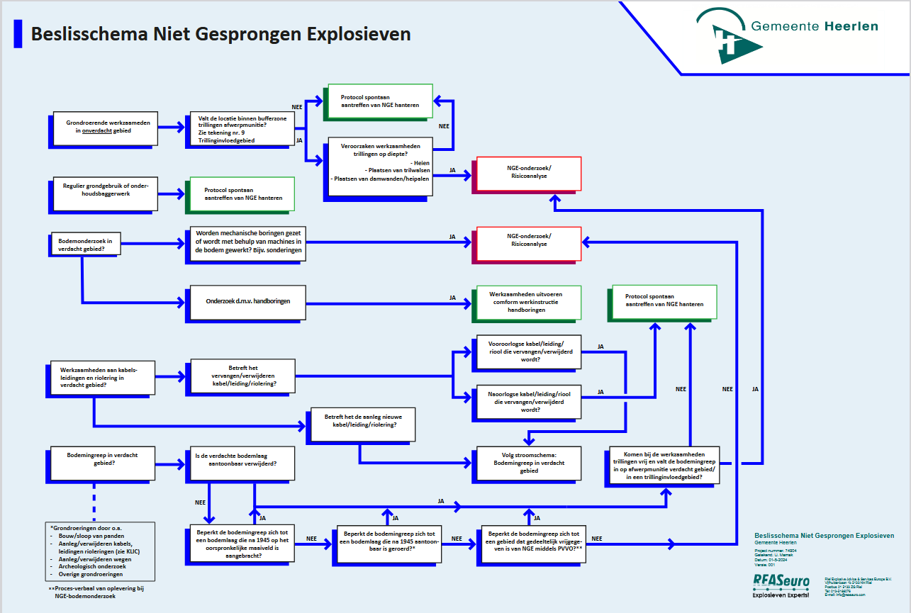 Aanvullend op het beslisschema is in paragraaf 8.5 van het onderzoek ‘Na-conflictperiode en risicoanalyse NGE gemeente Heerlen’ (bijlage 3) een lijst van veel voorkomende werkzaamheden opgenomen met hierbij aangegeven of aanvullend NGE onderzoek noodzakelijk is.