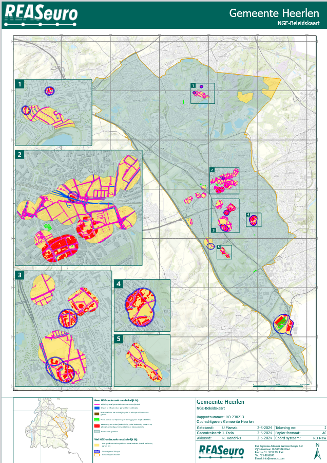 Om een beter inzicht te krijgen in de mogelijke aanwezigheid van NGE voor het gehele grondgebied van de gemeente Heerlen heeft de gemeente een NGE-risicokaart laten opstellen. Hiervoor is uitgebreid historisch vooronderzoek naar de gevechtshandelingen gedaan en is op basis van een analyse van bronnenmateriaal (zie hiervoor het rapport Vooronderzoek conflictperiode bijlage 2) bepaald in welke gebieden sprake is van een verhoogde kans op de aanwezigheid van NGE, de zogenaamde NGE verwachtingsgebieden. Uit de NGE-risicokaart blijkt dat na de Tweede Wereldoorlog voor een deel van het gemeentelijk grondgebied sprake is van een verhoogde kans op aanwezigheid van NGE.