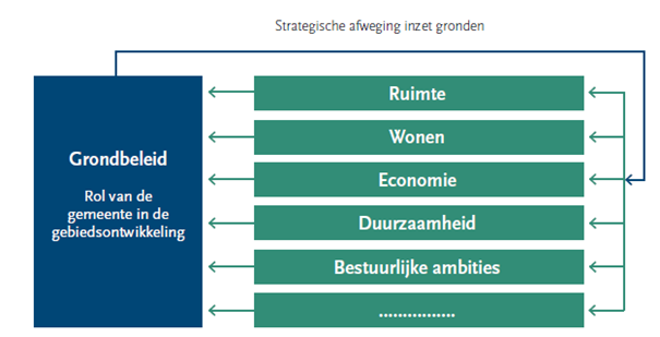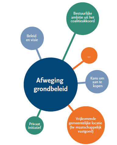 Er zijn meerdere invalshoeken om afwegingen in grondbeleid te maken. Zo kan een bestuurlijke ambitie het afwegingsproces initiëren, bijvoorbeeld ambities op het gebied van gezondheid, welzijn en zorg, passende woningen voor alle inwoners en duurzaamheid. Ook kan een private partij een initiatief voorleggen, dat al dan niet aan de ambities en opgaven van de gemeente voldoet. Onderstaand figuur geeft de verschillende invalshoeken weer die vragen om een afweging in de grondpolitiek.