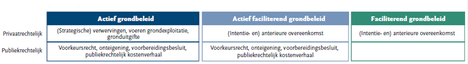 Elke vorm van grondbeleid heeft specifieke grondbeleidsinstrumenten. De gemeente zet deze grondbeleidsinstrumenten die passen bij de gekozen rol. Bij actief grondbeleid zet de gemeente in op (strategische) grondverwerving, past zij weloverwogen het voorkeursrecht toe en is onteigening niet uitgesloten. De gemeente stuurt actief op de functieverandering. Bij faciliterend grondbeleid stuurt de gemeente aan op het sluiten van een anterieure overeenkomst met een marktpartij. De functieverandering vindt pas plaats als de overeenkomst is gesloten en deze past binnen de beleidskaders van de gemeente. Het actief faciliterend grondbeleid richt zich op de samenwerking en inzet van grondbeleidsinstrumenten als het algemeen belang daarom vragen. De gemeente houdt gedeeltelijk regie door actief te sturen op de functieverandering zo mogelijk door een omgevingsplan op te stellen met kostenverhaalsregels.