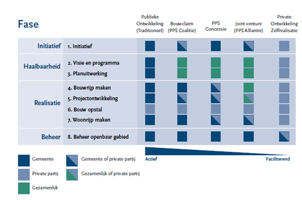 De gemeente kiest voor samenwerken met een marktpartij als zij het risico van een ruimtelijk initiatief niet volledig zelf wil lopen. Ook kan de inbreng van kennis en ervaring van een marktpartij in een ruimtelijk initiatief een overweging zijn om samen te werken. In welk stadium van het ruimtelijke initiatief de samenwerking plaatsvindt en hoe deze samenwerking er dan uit ziet, hangt af van het grondbeleid dat de gemeente voert. Ook de keuze van de gemeente om regie te blijven voeren en mate van grondposities in het gebied bepalen uiteindelijk de samenwerkingsvorm. Hierbij valt een onderscheid te maken in:
