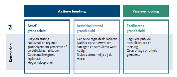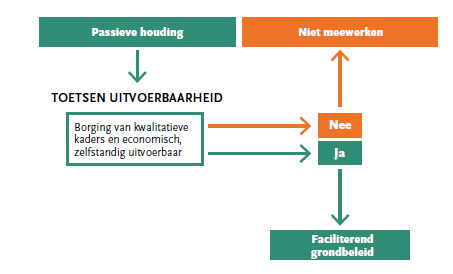 Uit de keuze voor een houding volgt dat de gemeente haar rolneming in het grondbeleid bepaalt. Bij een actieve houding weegt de gemeente aan de hand van het afwegingskader en de toets op de uitvoerbaarheid of haar rol actief grondbeleid of actief faciliterend grondbeleid moet zijn. Bij een passieve houding neemt de gemeente haar rol aan van passief grondbeleid. Zij maakt dan nog wel de toets of het ruimtelijk initiatief kan blijven voldoen aan de beleidskaders van de gemeente en economisch zelfstandig uitvoerbaar is. Anders geeft zij geen vervolg aan het initiatief.