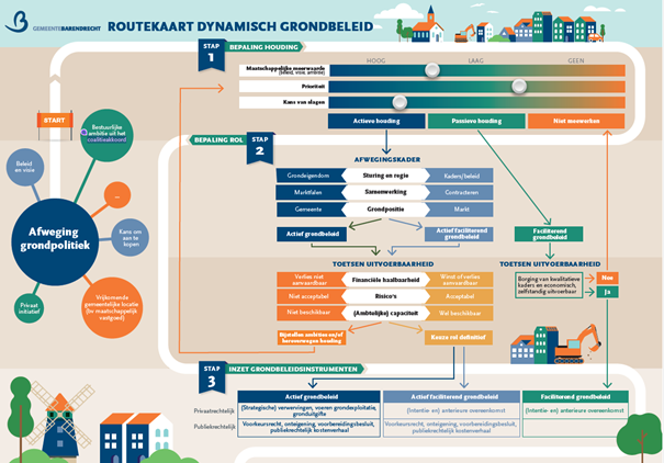 In onderstaand figuur is schematisch de keuze in het dynamisch grondbeleid in verschillende stappen weergegeven. Deze keuze maakt de gemeente met de routekaart. Het onderstaande schema laat zien dat de gemeente eerst haar houding voor een ruimtelijk initiatief bepaalt (stap 1). Daarna volgt keuze van haar grondbeleid (stap 2), om vervolgens de bijbehorende instrumenten toe te passen (stap 3).