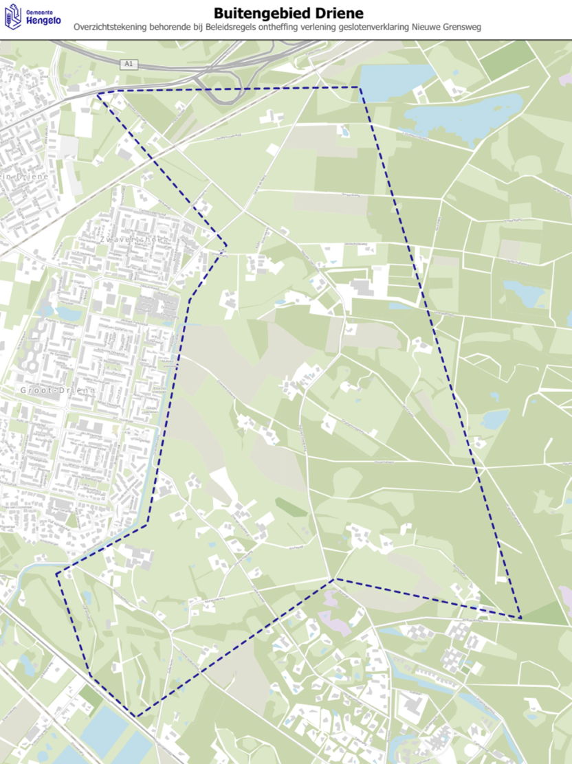 Buitengebied Driene: het gebied buiten de bebouwde kom tussen de gemeente Hengelo en Enschede, omsloten door de Oldenzaalsestraat, bebouwde kom van Hengelo, gemeentegrens Enschede en Enschedesestraat inclusief Boshofweg, Drienermarkerweg en Leutinkweg in Enschede dat is aangegeven op de overzichtstekening behorende bij deze beleidsregels.