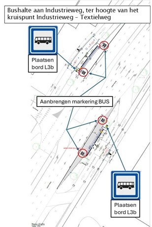 a) aan beide kanten van de Industrieweg, ter hoogte van het kruispunt Industrieweg – Textielweg;
