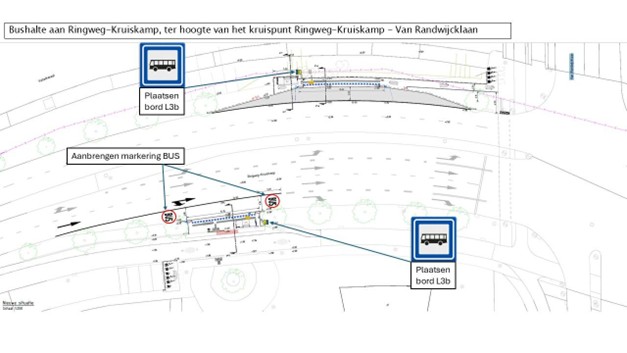 De bushaltes worden op alle locaties aangewezen middels verkeersbord L3(bushalte) van bijlage 1 van het RVV 1990. Daarnaast worden de bushaltes voorzien van geblokte markering waarmee kenbaar gemaakt wordt over welke lengte langs de weg de halte zich bevindt. Het is langs deze geblokte markering niet toegestaan stil te staan door bestuurders van andere voertuigen dan autobussen, tenzij dit gedaan wordt voor het onmiddellijk laten in- en uitstappen van passagiers. Aan de bushalte “Industrieweg” aan beide kanten van de Industrieweg, ter hoogte van het kruispunt Industrieweg – Textielweg en aan de bushalte “Van Randwijcklaan” aan de zuidelijke kant van Ringweg-Kruiskamp, ter hoogte van het kruispunt Ringweg-Kruiskamp - Van Randwijcklaan, wordt voor de bushalte een deel van de rijbaan aangewezen als busstrook middels het aanbrengen van de markering “BUS” als bedoeld in artikel 81 van het RVV 1990.