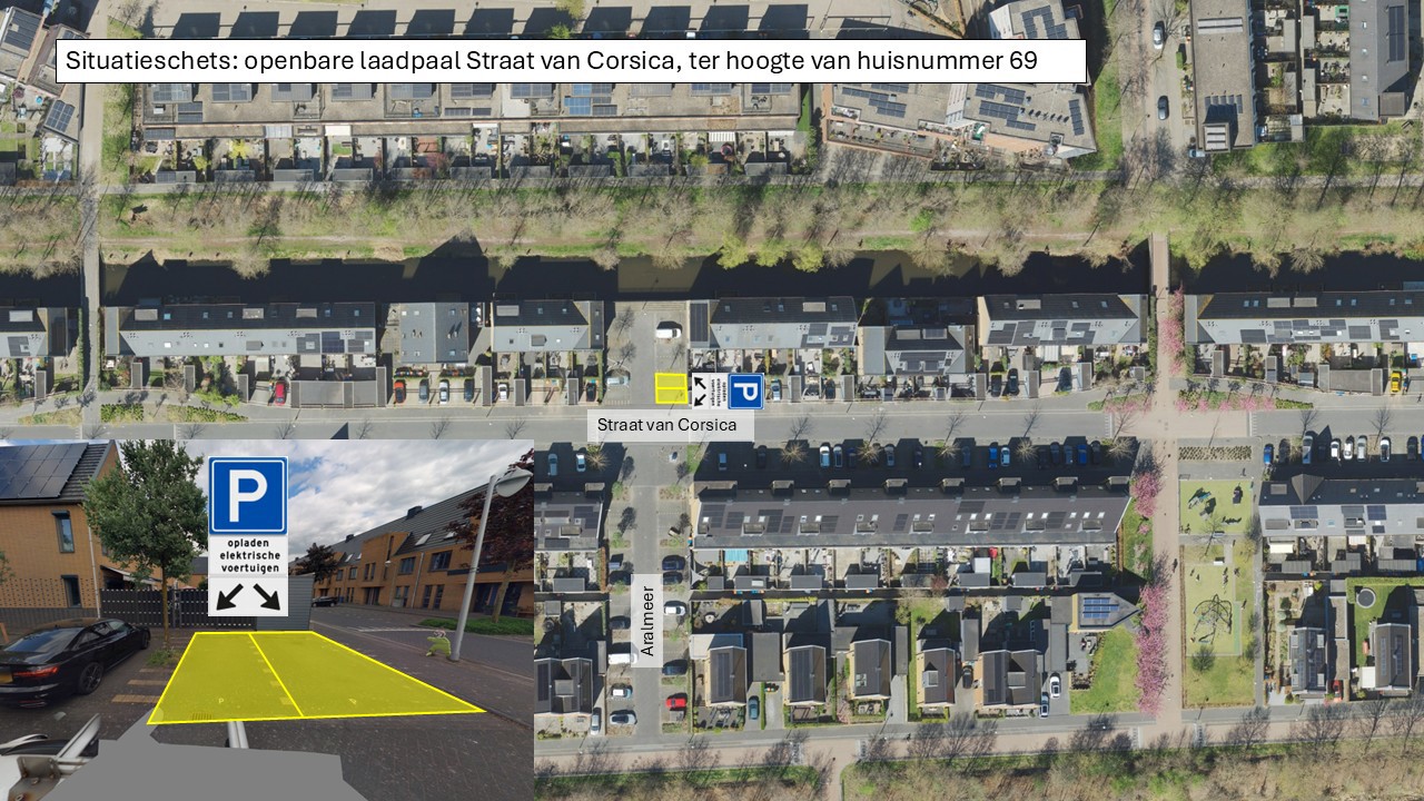 om op Straat van Corsica ter hoogte van huisnummer 69 twee parkeervakken gelegen bij het oplaadpunt voor elektrische voertuigen aan te wijzen als parkeerplaats voor het opladen van elektrische voertuigen, volgens de bijlage bij dit besluit;