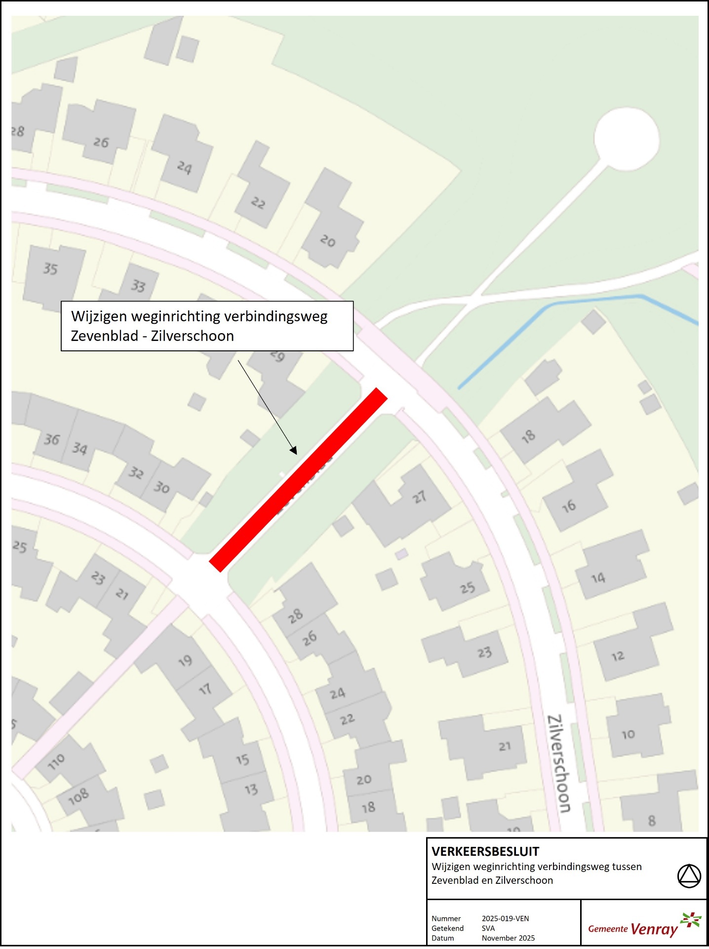 Verkeersbesluit – Wijzigen weginrichting – verbindingsweg tussen Zevenblad en Zilverschoon Venray