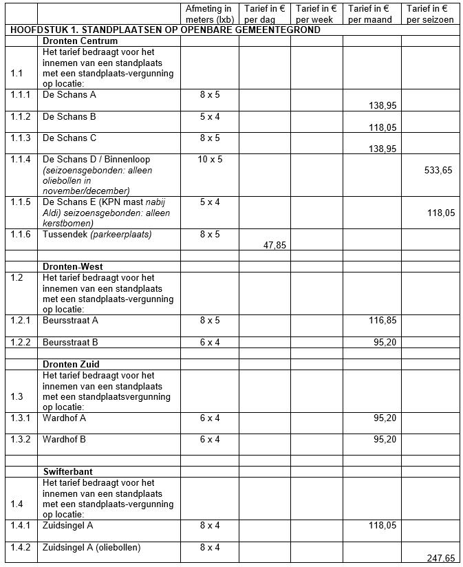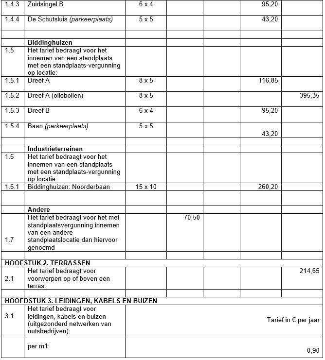 Indien in de tarieventabel voor het hebben van voorwerpen waarvoor zowel een jaar-, maand- week- als dagtarief is opgenomen, is voor de berekening van de precariobelasting het tarief van toepassing dat het meest aansluit bij een ter zake door de gemeente verleende vergunning. In de gevallen waarin geen vergunning is verleend, geldt het tarief voor de kleinste tijdseenheid.