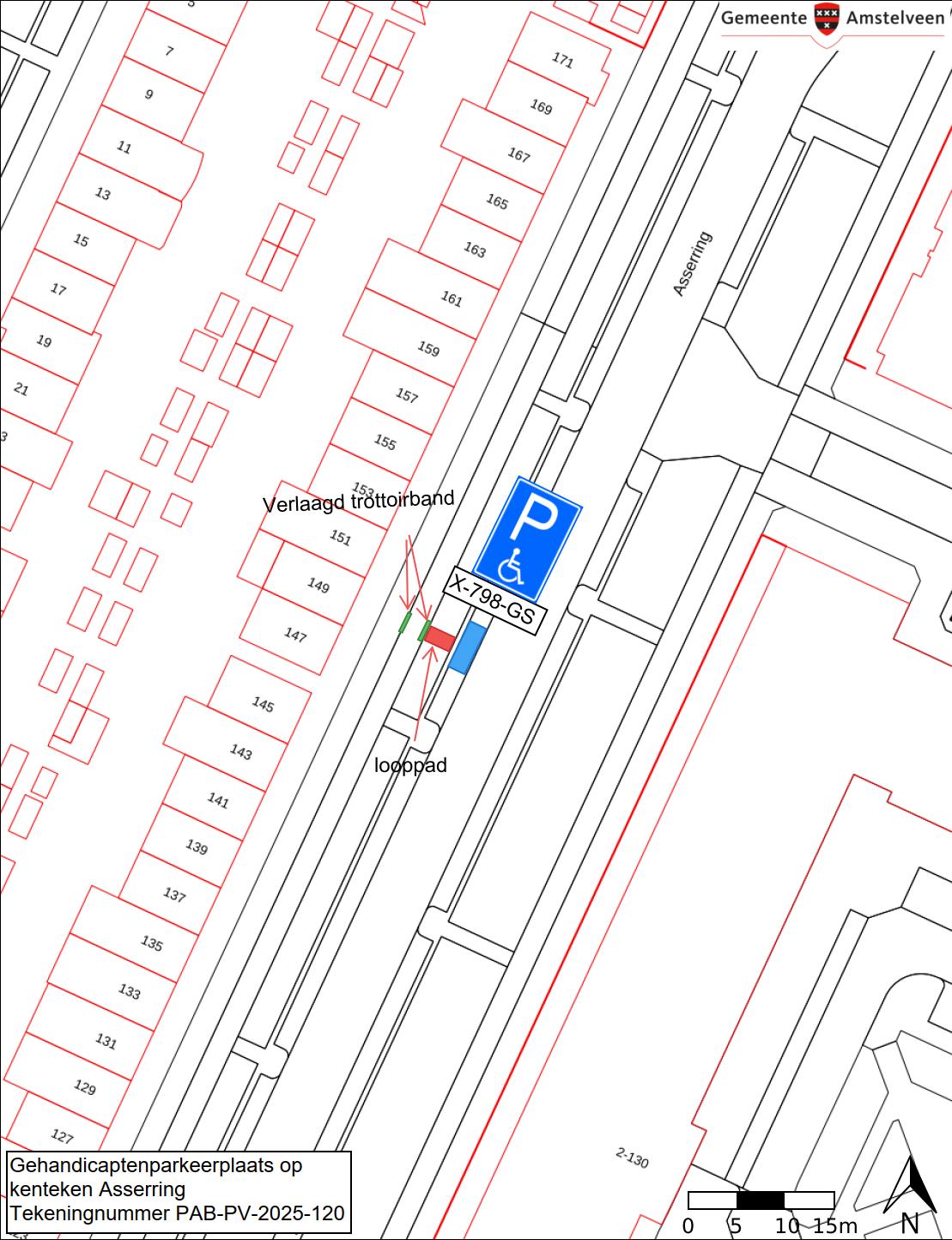Burgemeester en wethouders van Amstelveen besluiten het parkeren te verbieden op een parkeerplaats in de straat Asserring, zoals aangegeven op tekening PAB-PV-2025-120, met uitzondering van het voertuig met het kenteken X-798-GS (gehandicaptenparkeerplaats).