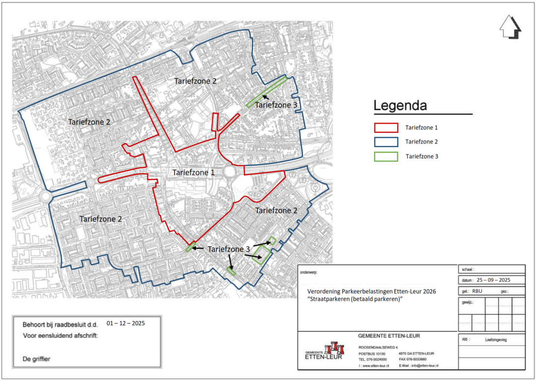 Tariefzone 3: Het gebied omsloten door tariefzone A en B, zoals is aangegeven op de bijbehorende kaart bij de verordening op de heffing en invordering van parkeerbelastingen Etten-Leur 2026 “straatparkeren (betaald parkeren)”. Een en ander met uitzondering van de parkeerlocaties (terrein of garage) voorzien van een slagboominstallatie of parkeerschijfzone.