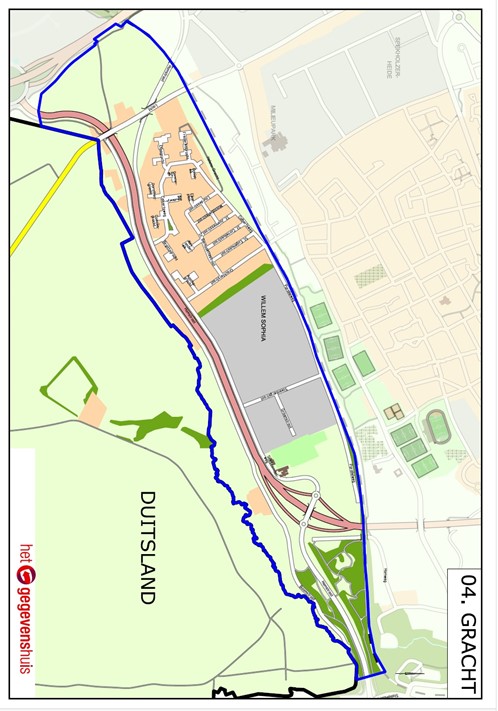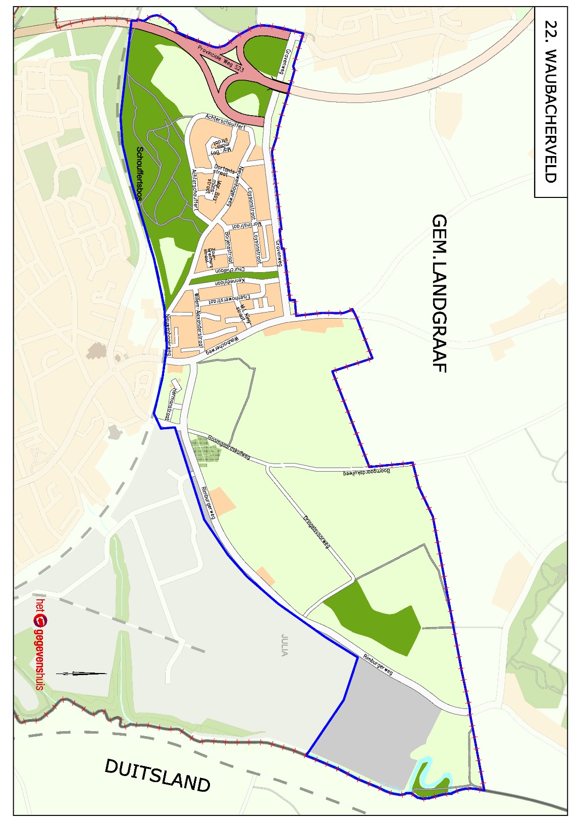 Het gebied, grofweg begrensd door de Gravenweg, Waubacherweg, groenvoorziening tussen de Waubacherweg en de Boomgaardskuilweg, Boomgaardskuilweg, Groenvoorziening tussen de Boomgaardskuilweg en de Rimburgerweg, groenvoorziening tussen de Rimburgerweg en de grens met Duitsland, de grens met Duitsland (rivier de Worm), Militair complex Eygelshoven, Rimburgerweg, achterzijde bedrijven Albert Thijsstraat, Putstraat, de spoorlijn, de N300 en de aan de westelijke zijde gelegen op- en afrit van de N300.