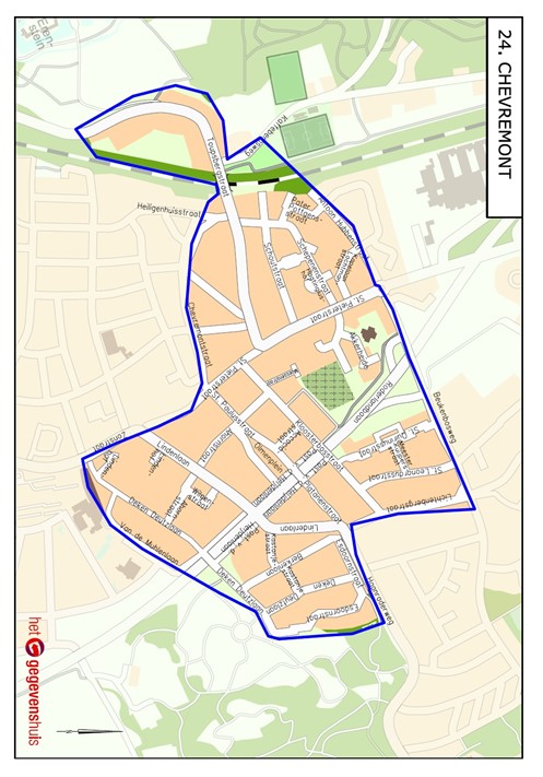 Het gebied, grofweg begrensd door de Beukenbosweg, Lichtenbergstraat, Haanraderweg, achterzijde woningen Esdoornstraat, Deken Deutzlaan, Directeur Van der Mühlenlaan, Zonstraat, St.Pieterstraat, Chevremontstraat, de spoorlijn, Brugmolenweg, achterzijde woningen Toupsbergstraat, Kaffebergsweg, terrein tussen Kaffebergsweg en Antoon Hubbenstraat (bij voetbalvelden VV Chevremont) en Antoon Hubbenstraat.