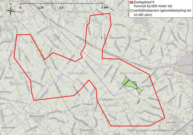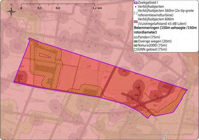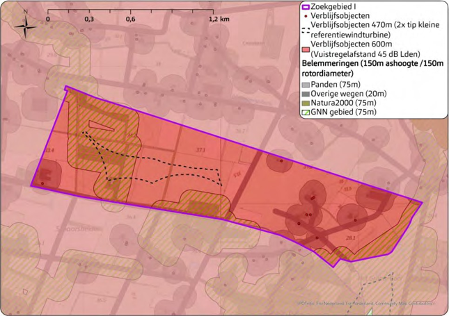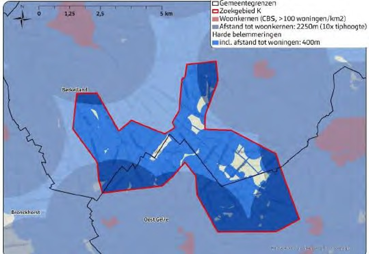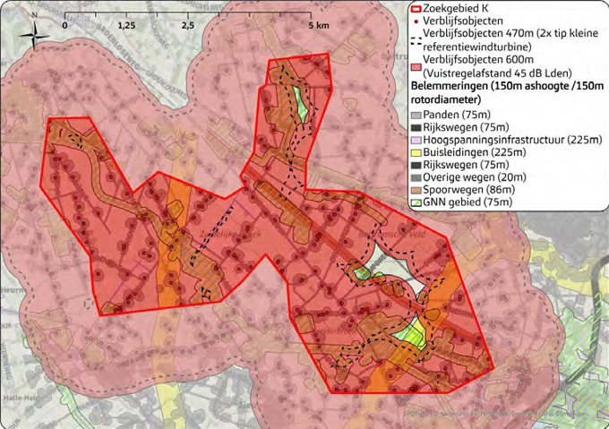 Wanneer op basis van de bovenstaande belemmeringenkaarten wordt gekeken welk gedeelte van zoekgebied K voor het plaatsen van deze referentieturbines in aanmerking zou kunnen komen, dan blijkt bij een geluidsnorm van 45dBLden dat deze geluidsnorm maatgevend is en om een grotere afstand ten opzichte van gevoelige functies vraagt dan de vaste afstandsnorm van tweemaal de tiphoogte. Dit levert dat het onderstaande beeld op: