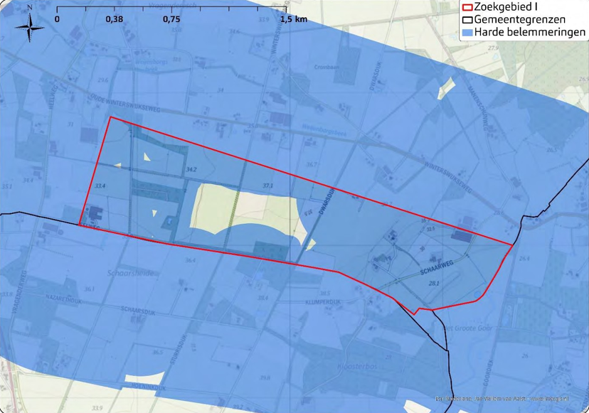 Figuur 5. Kaart met harde belemmeringen binnen zoekgebied I (bron: Bosch & van Rijn, 2022).