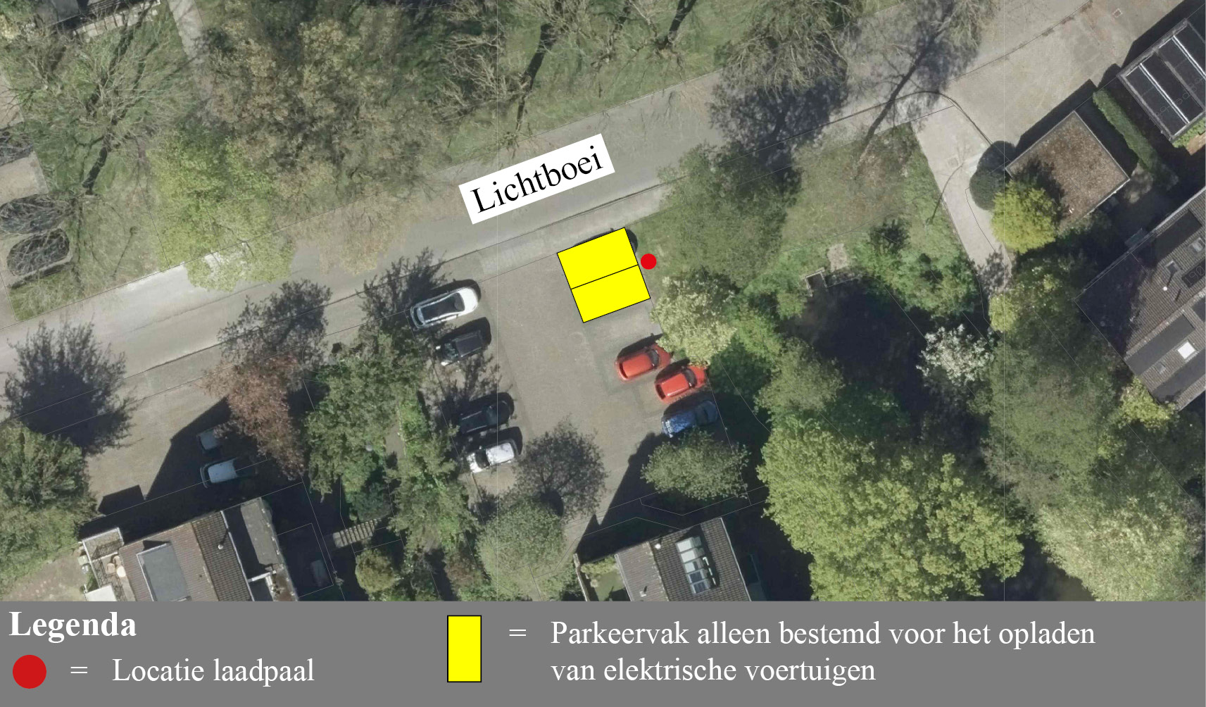 Wij besluiten op grond van bovenvermelde overwegingen twee parkeervakken, bij de laadpaal aan de Lichtboei ten noorden van het gebouw met de nummers 165-176, aan te wijzen als parkeervakken alleen bestemd voor het opladen van elektrische voertuigen middels plaatsing van bord E8c uit bijlage 1 van het Reglement verkeersregels en verkeerstekens 1990 met een onderbord (conform artikel 8 BABW) met daarop pijlen, waaruit blijkt dat het bord voor twee parkeervakken van toepassing is.