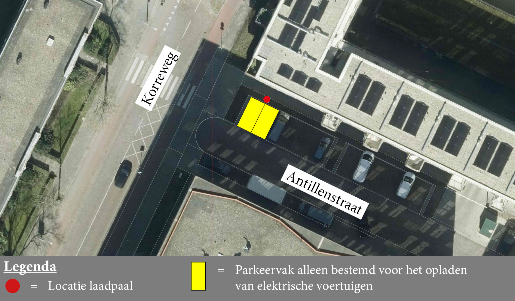 Wij besluiten op grond van bovenvermelde overwegingen twee parkeervakken, bij de laadpaal aan de Antillenstraat ter plaatse van nummer 23 (nabij het kruispunt met de Korreweg), aan te wijzen als parkeervakken alleen bestemd voor het opladen van elektrische voertuigen middels plaatsing van bord E8c uit bijlage 1 van het Reglement verkeersregels en verkeerstekens 1990 met een onderbord (conform artikel 8 BABW) met daarop pijlen, waaruit blijkt dat het bord voor twee parkeervakken van toepassing is.