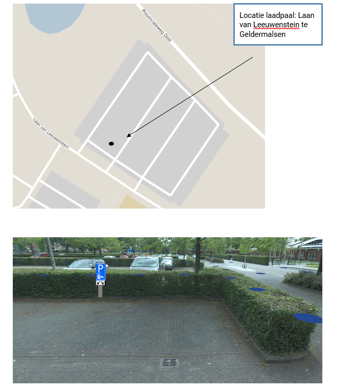 het aanwijzen van twee parkeerplaatsen op Laan van Leeuwenstein ter hoogte van huisnummer 6 te Geldermalsen, parkeergelegenheid alleen bestemd voor elektrische voertuigen, door het plaatsen van borden E8c van bijlage 1 van het Reglement Verkeersregels en Verkeerstekens 1990, voorzien van een onderbord “Opladen elektrische voertuigen” en daaronder bord OB504.