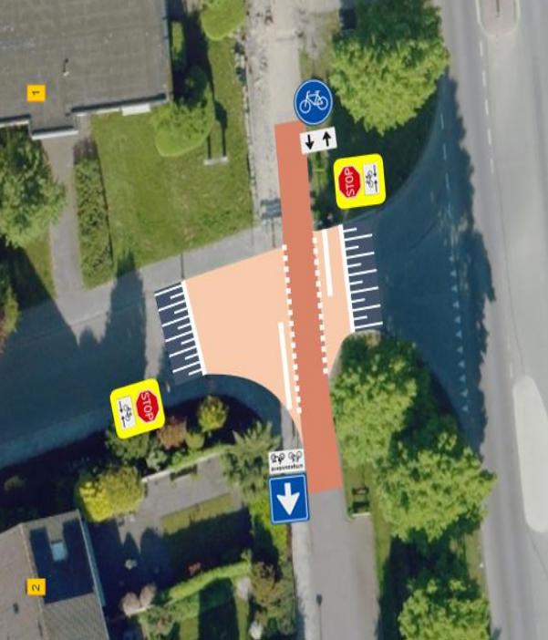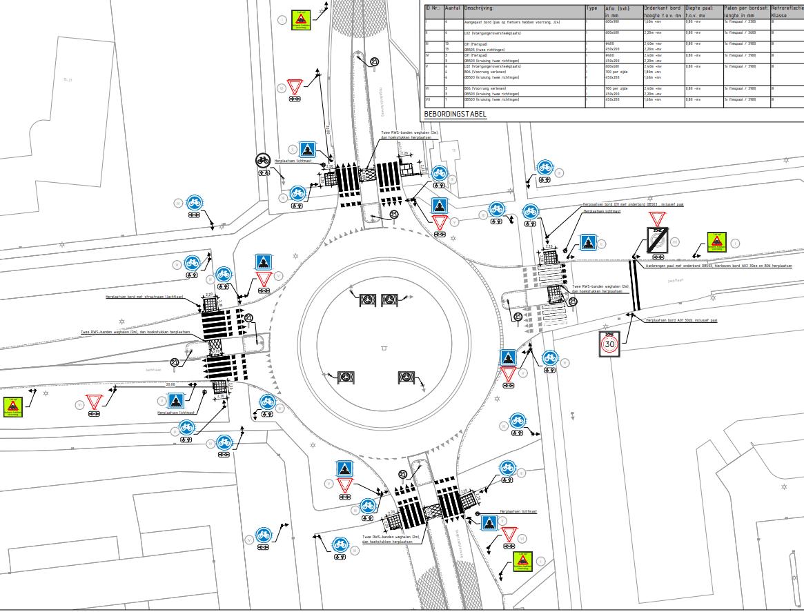 De uitbreiding van de bestaande borden G11 ‘Fietspad’ dient ter verduidelijking van de fietspaden en dat de rotonde in twee richtingen kan worden bereden door fietsers. Dit is voor zowel fietsers als bestuurders van voertuigen op de weg te zien door de onderborden met daarop peilen dat verkeer vanuit twee richtingen kan komen.