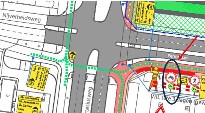 door de aanleg van het afgesloten bouwterrein een groot deel van het fietspad en voetpad afgesloten wordt vanwege kruisend bouwverkeer;