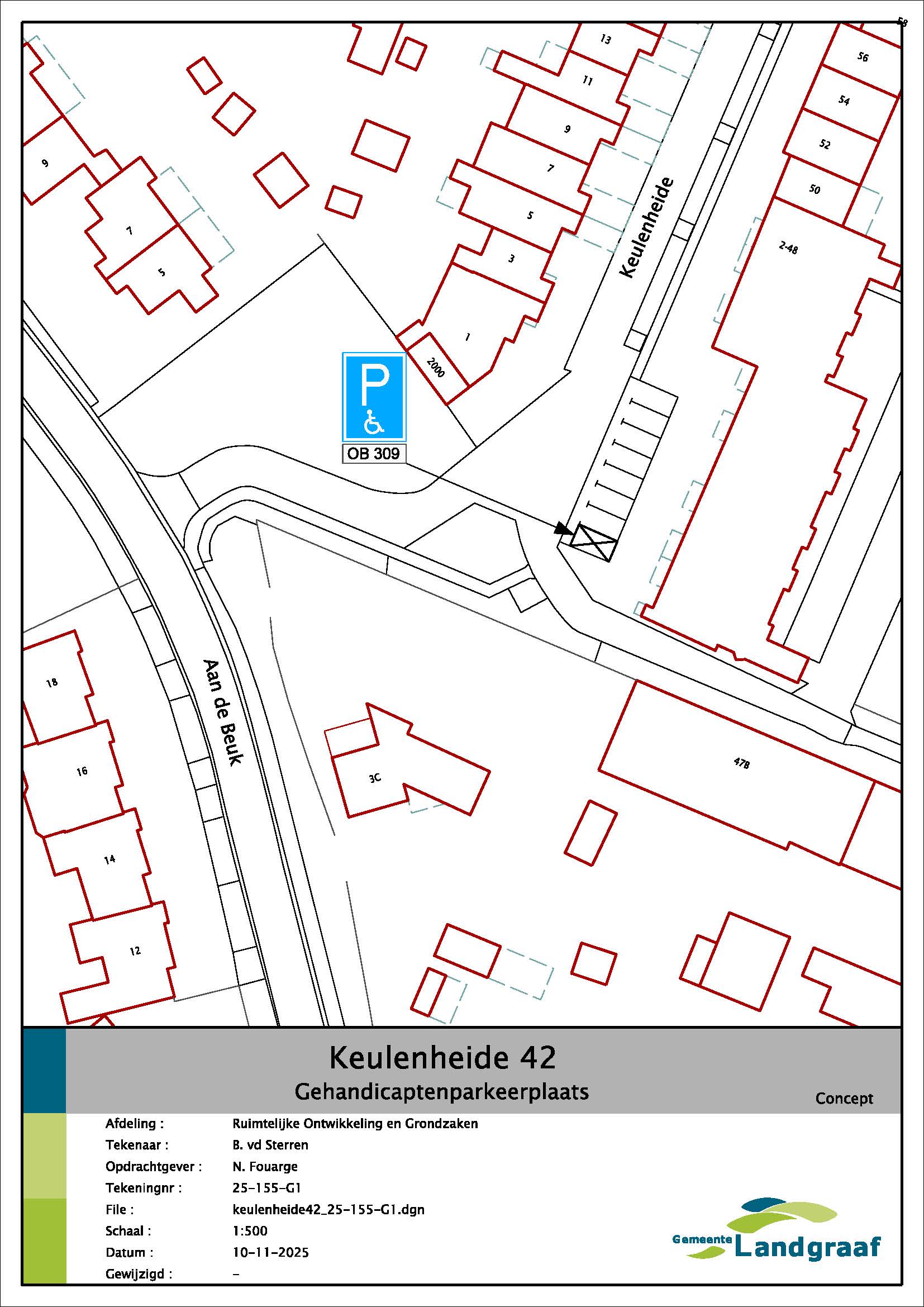 De gemeente heeft een verzoek ontvangen voor het aanwijzen en inrichten van een gehandicaptenparkeerplaats op kenteken nabij de Keulenheide 42.