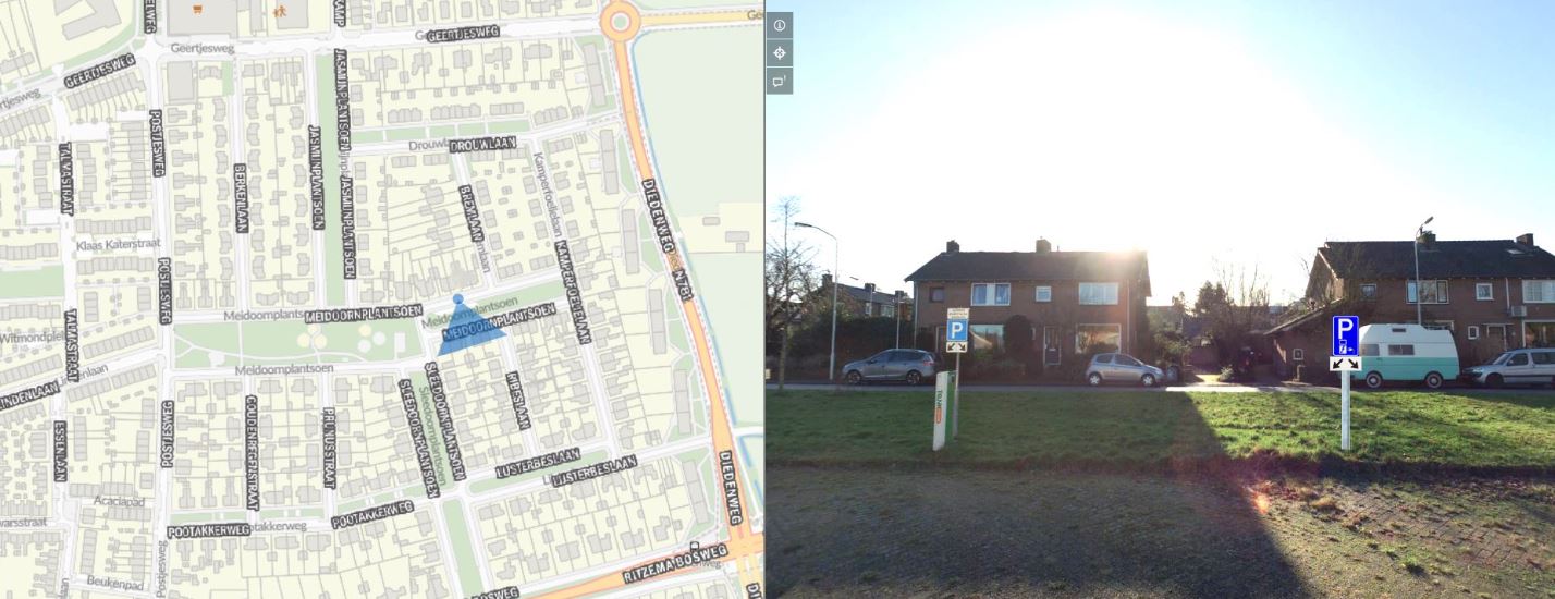 In de afbeelding hierboven staat links met een blauwe driehoek aangegeven waar de laadpaal zou gaan komen komen. Rechts kunt u zien welke twee extra parkeervakken gereserveerd zouden worden. Dit besluit wordt dus ingetrokken.